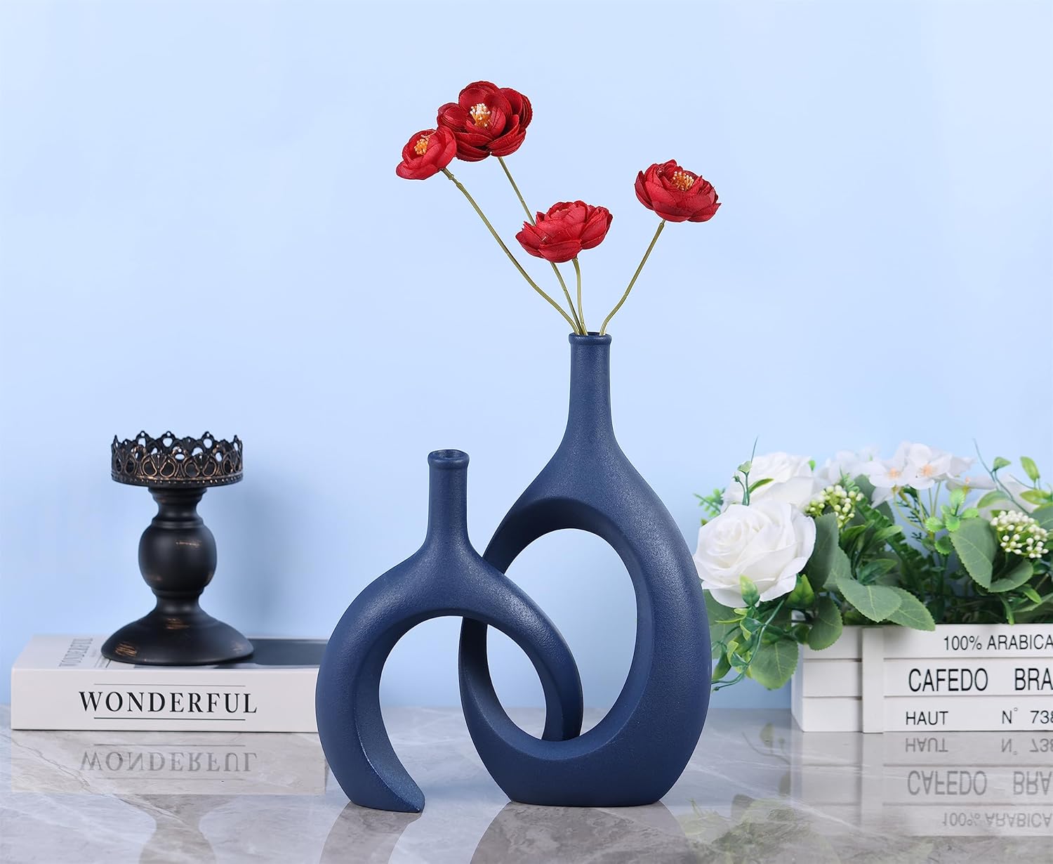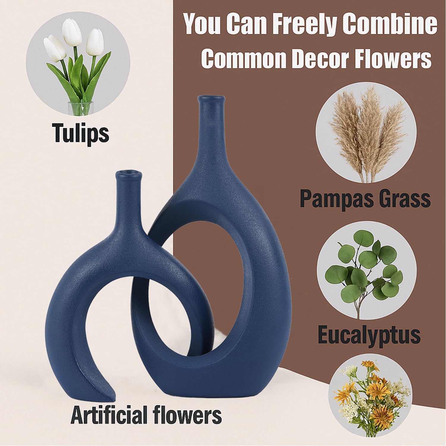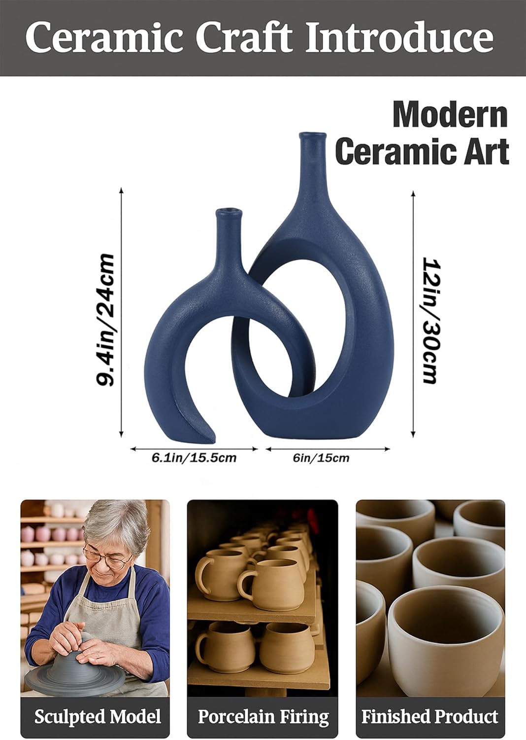 - VERSATILE AND STUNNING DESIGN: This blue boho modern decor vase set measures 6.1"L*12.0"H (Large) and 6.1"L*9.4"H (Small), offering endless possibilities . Its stunning nestled ceramic design makes it a beautiful stand-alone piece, or you can enhance it with artificial flowers, stems, bouquets, pampas grass, or greenery for vibrant color. Perfect as a table centerpiece, family room, mantel, dining room, bathroom, or on a shelf on a covered patio - it will add a touch of elegance and sophistication wherever it is placed.