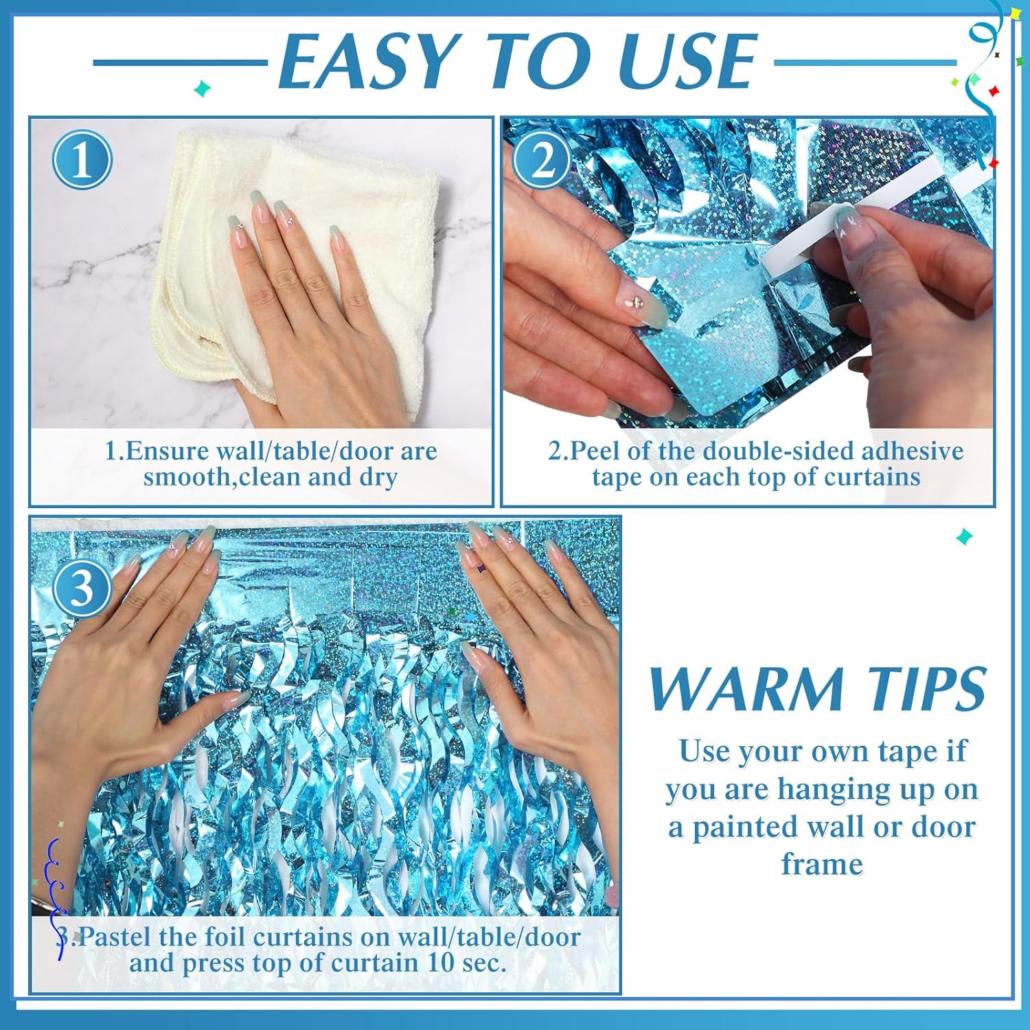 - Easy to Assemble: the tinsel curtain backdrop has a tape behind it for you to stick on decorative places such as walls, windows, tables and doors to create a blue world, full of romantic atmosphere, so that you and your partners can have fun, and you can take pictures for memory