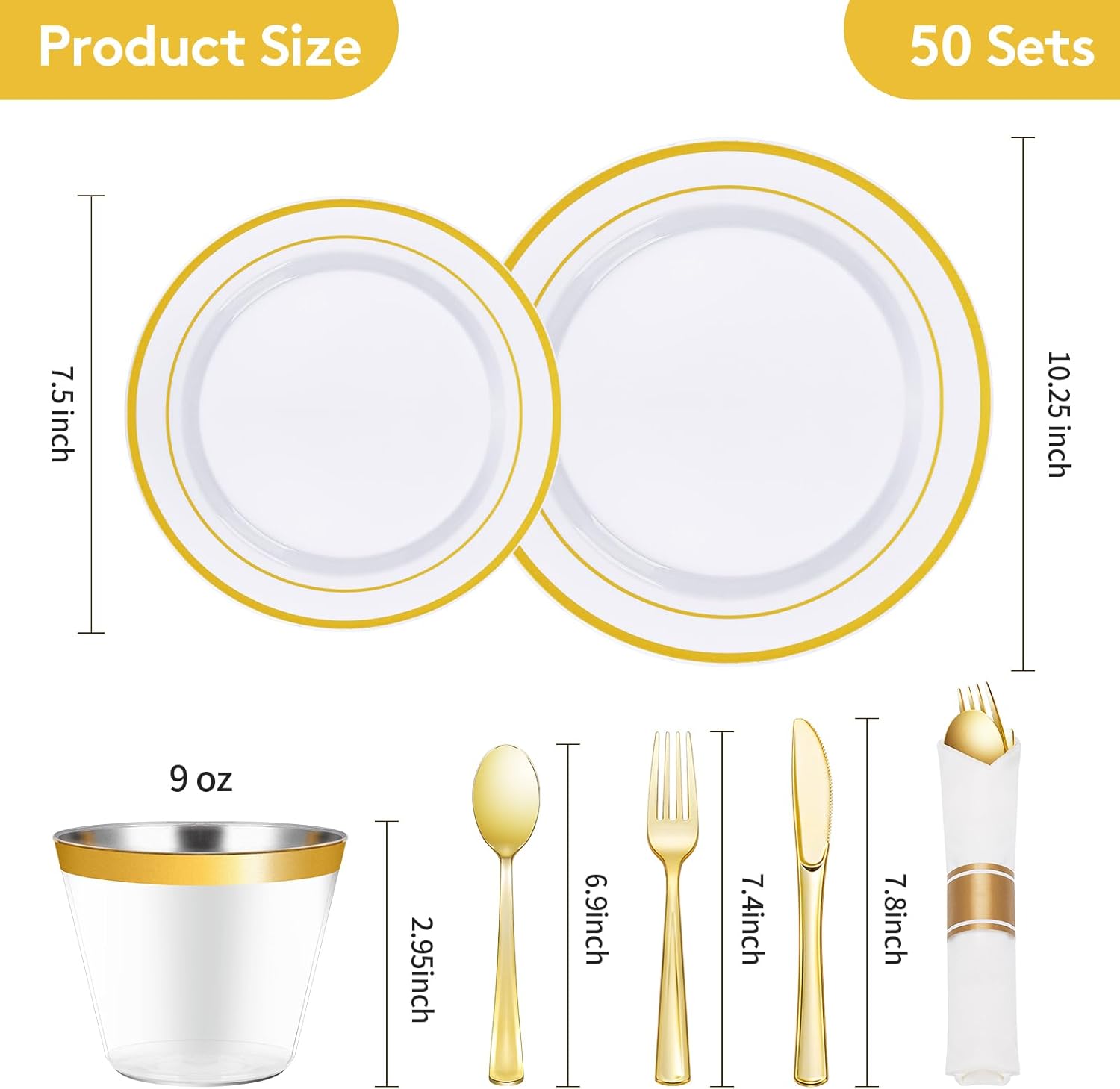 - WHAT YOU GET - 350Pcs gold party plates sets for 50 guests with 50 10.25" dinner plates, 50 7.5" salad plates, 50 Paper Napkins, 50 9oz cups, 50 knives, 50 forks, and 50 spoons.