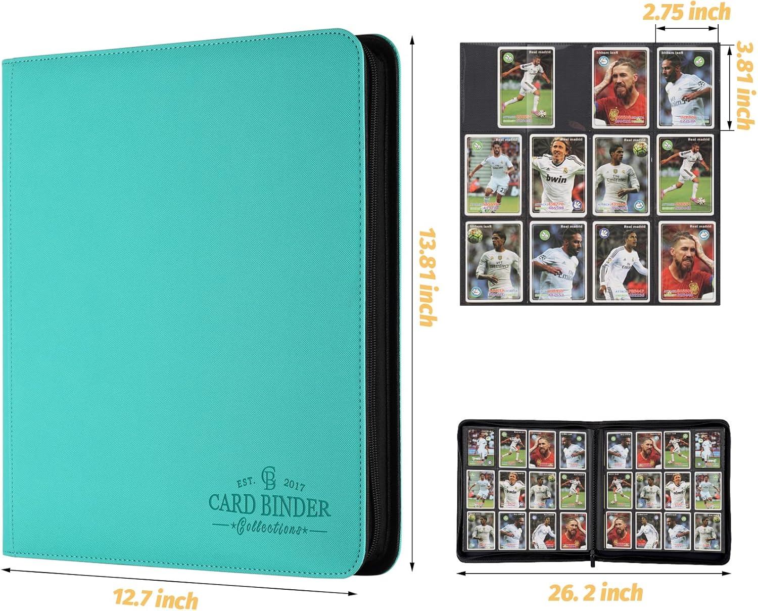 - 【Size】Trading Card Binder-12 Pocket Inner Pocket Size: 2.75in x 3.81in - Folder Size: 7.5in x 9.8in. And it is lighweight for carrying it anywhere.