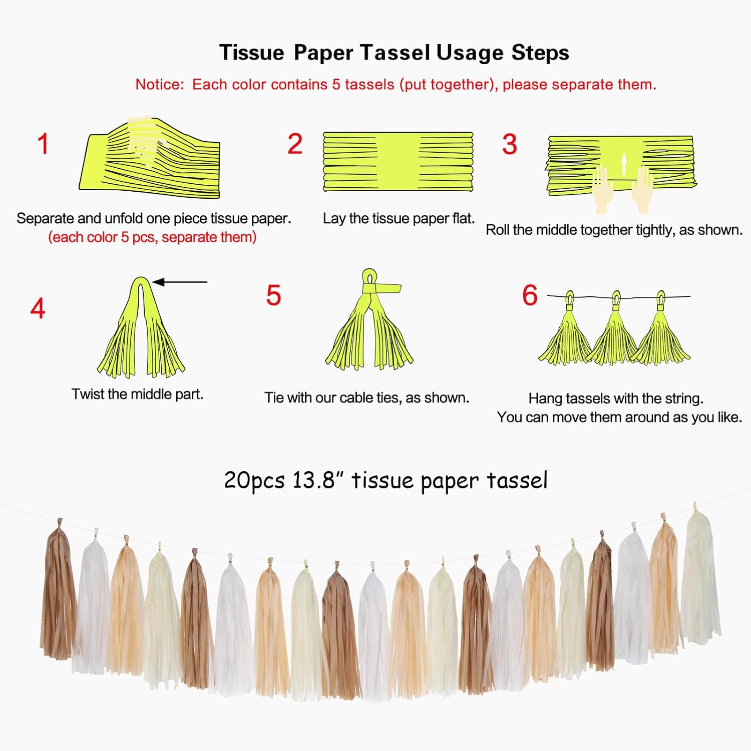 - 【Garland includes】20tassels,5pcs ivory tassel garland, 5pcs white tassel garlands, 5pcs champagne garlands,5pcs light brown garlands. Each tassel is about 14" long after assembled. And each garland comes with a 10ft long free String for hanging these tassels.