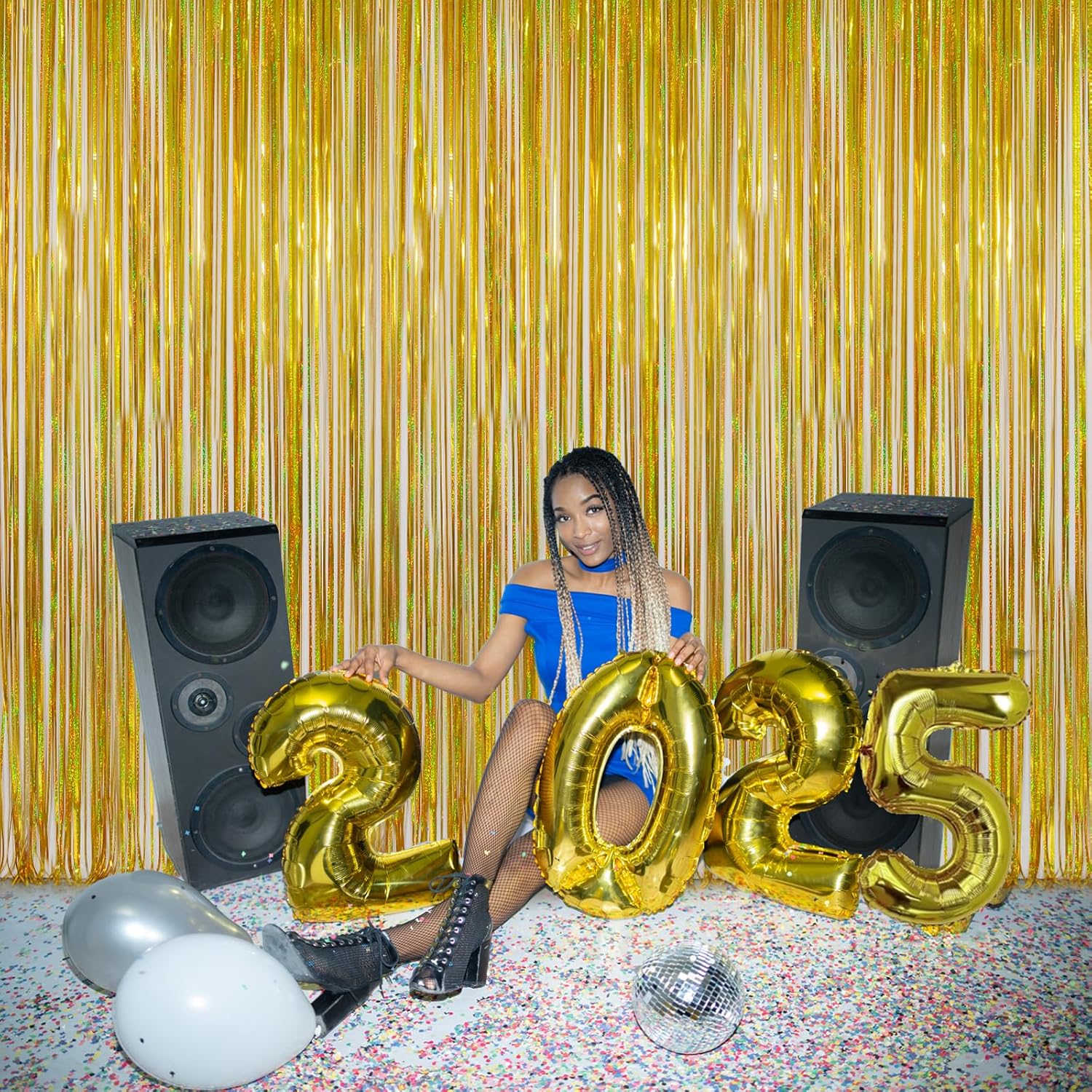 Foil Fringe Curtains Party Decorations - Melsan 3 Pack 3.2 x 8.2 ft Tinsel Curtain Party Photo Backdrop for Birthday Party Baby Shower or Graduation Decorations (Pure Gold)