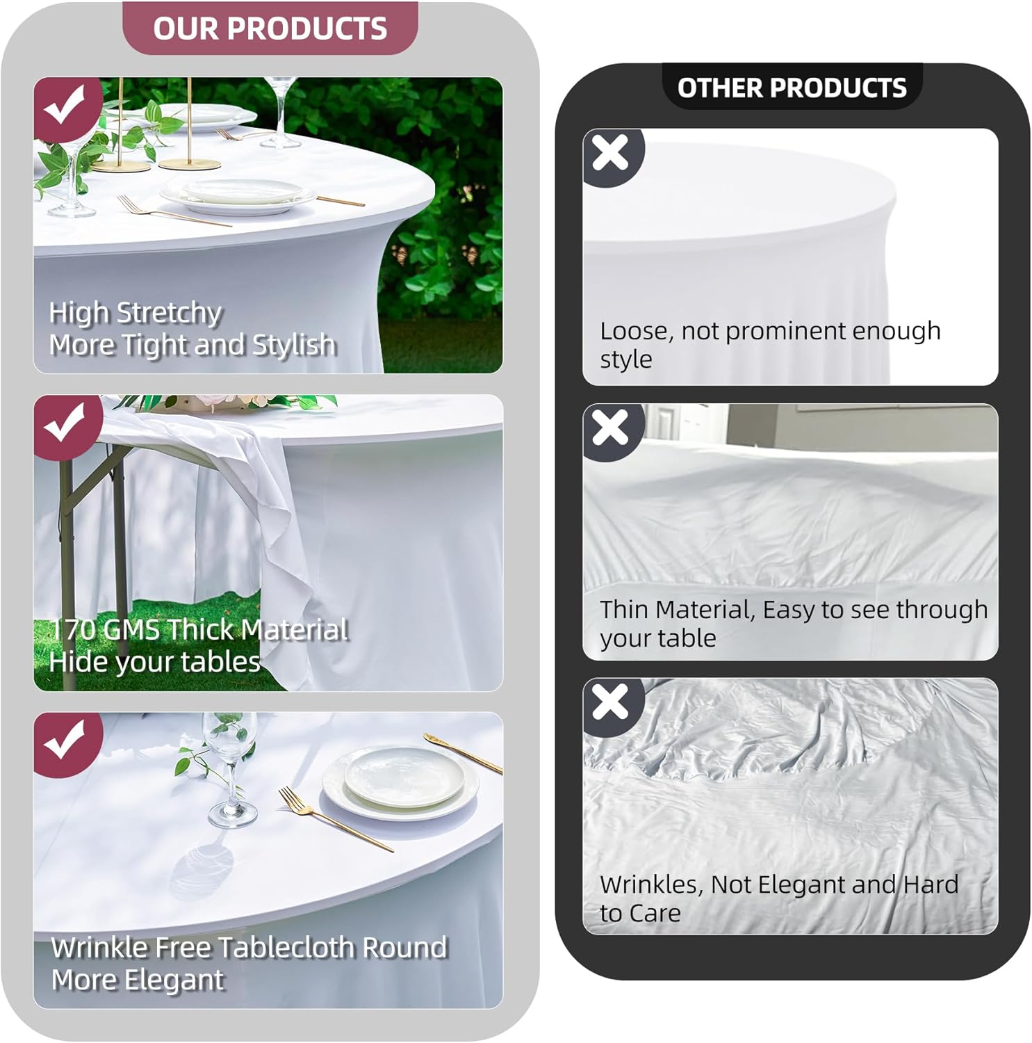 - 【High Stretch Spandex Fabric】- The round spandex table cloth is made of high quality 170GSM 85% polyester and 15% spandex, thick, not see through and more elastic compared with 10% spandex table covers round, wrinkle free, smooth and good drape, easily dress up your party and make it look more elegant.