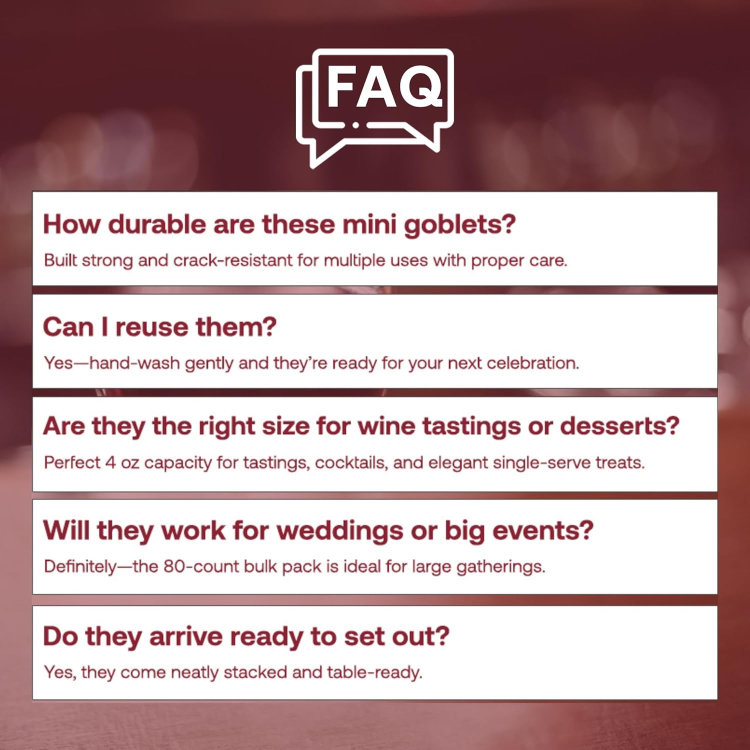 - PREMIUM QUALITY & UNBREAKABLE – Made from sturdy plastic, these 4 oz mini goblets offer the elegance of glass without the risk. Perfect plastic goblets for parties, weddings, or any celebration where durability matters!