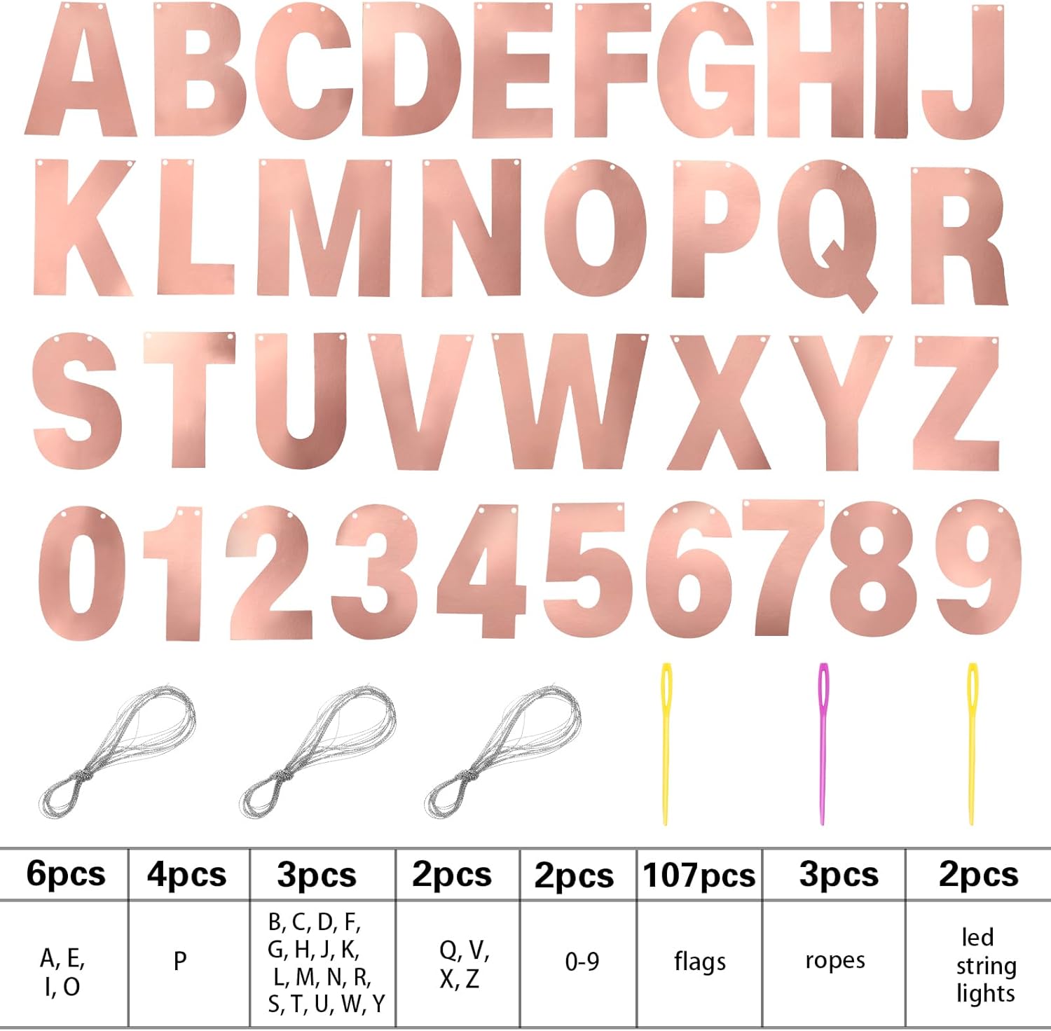 TaoBary 112 Pcs DIY Letter Custom Banner Glitter Customizable Banner Kit Including 107 Letters and Numbers 3 Rope for Valentine Birthday Party(Bright Rose Gold)