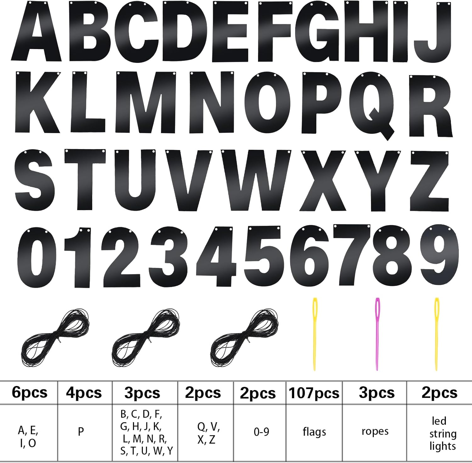 - DIY Banner Kit with Letters: you will get 107 pieces of letters and numbers, including 6 'A, E, I, O' letters, 4 'P' letters, 3 'B, C, D, G, H, J, K, L, letter M, N, R, S, T, U, letter W, Y, F shape' letters, 2 'Q, V, X, Z' letters and 2 '0-9' numbers, come with 3 ropes; Nice combination meet your various parties decorative demands