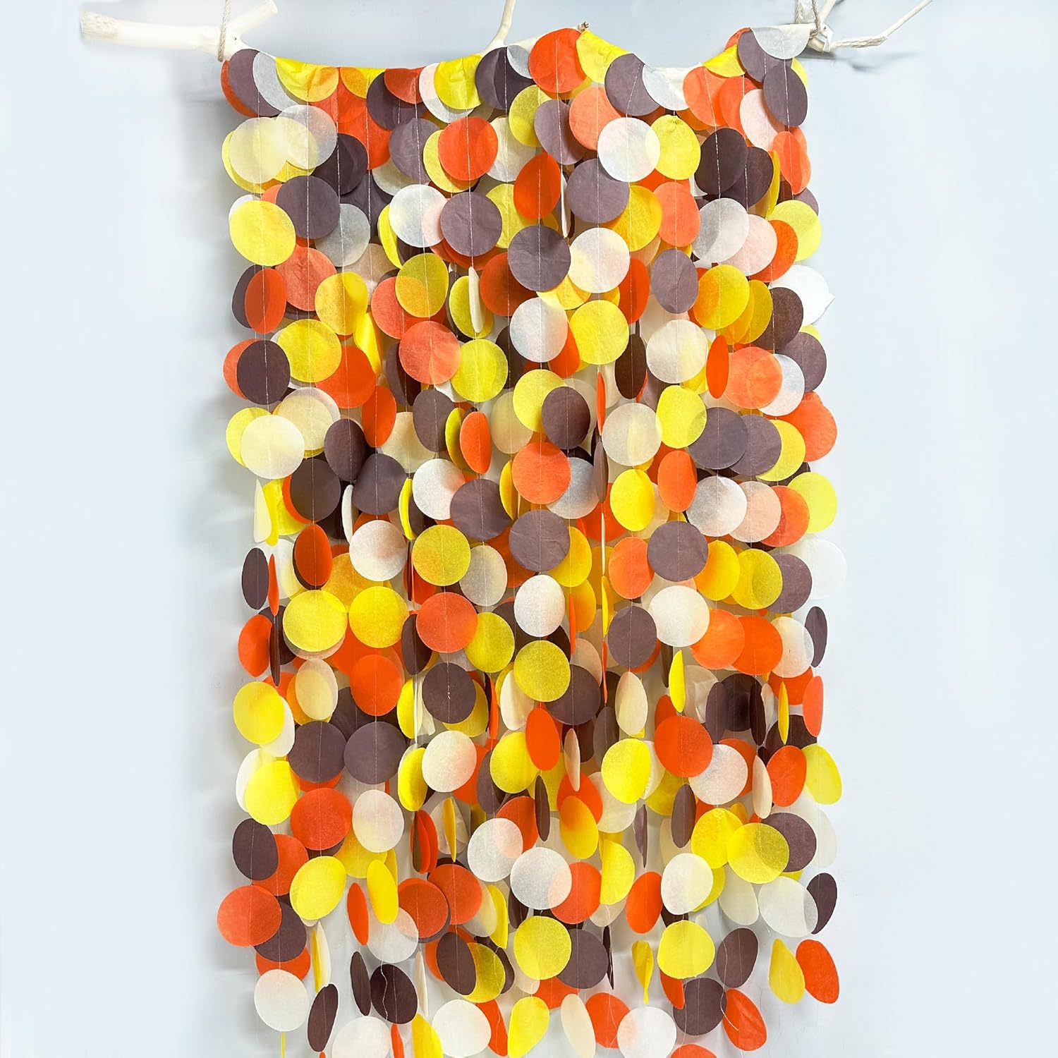 - 🟤ENVIRONMENTAL MATERIAL-Our orange brown beige yellow big circle dot streamer garland are made of high quality tissue paper,carefully hand-made and machine-sewn together with thread.durable and reusable.Unroll & unwrap the tissue paper garland carefully. Due to delicate nature of thread, may tangle.