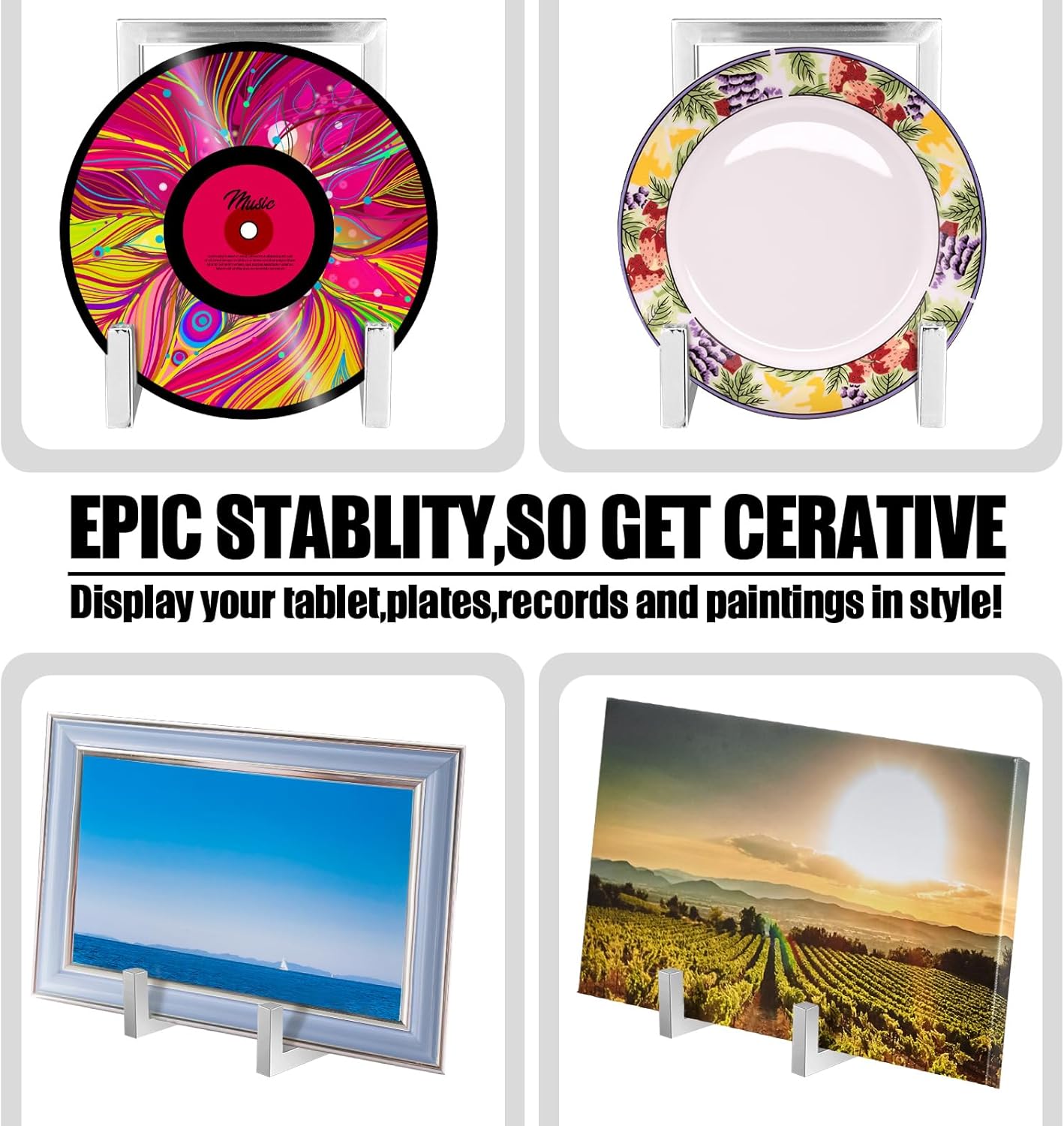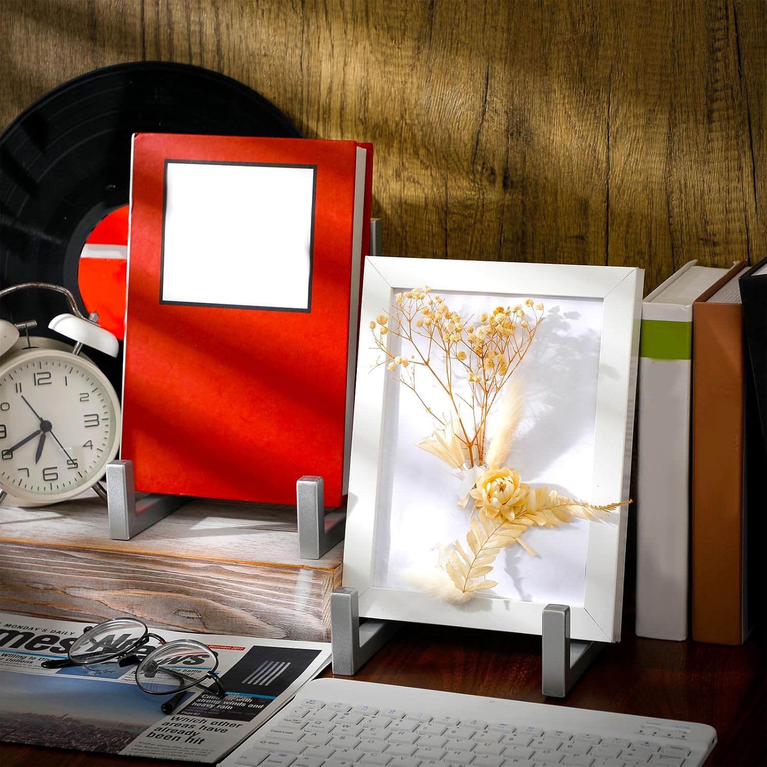 - Industrial Style: as you can see in the pictures, our picture frame holder stand comes in silver color, presenting a modern and industrial visual effect; Meanwhile, they adopt geometric lines and shapes, smooth and simple, adding a sense of aesthetic beauty to your tabletops and shelves