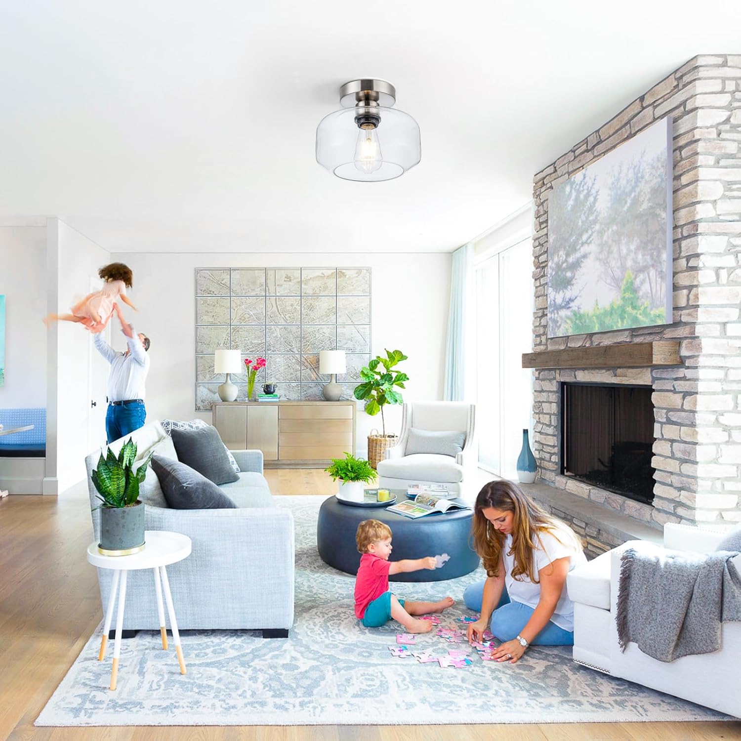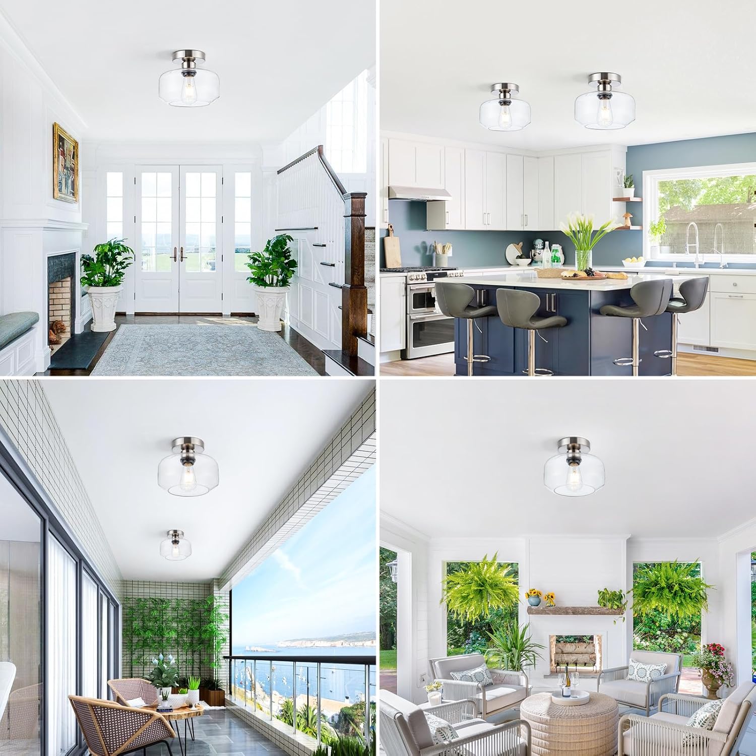 - ✨ Premium Semi Flush Mount Design 1.Retro-modern brushed nickel ceiling light with hand-blown clear glass shade offering crystal-clear transparency. Rust-resistant metal base fits farmhouse, vintage and modern decors. Perfect as hallway light fixtures or bathroom ceiling light.