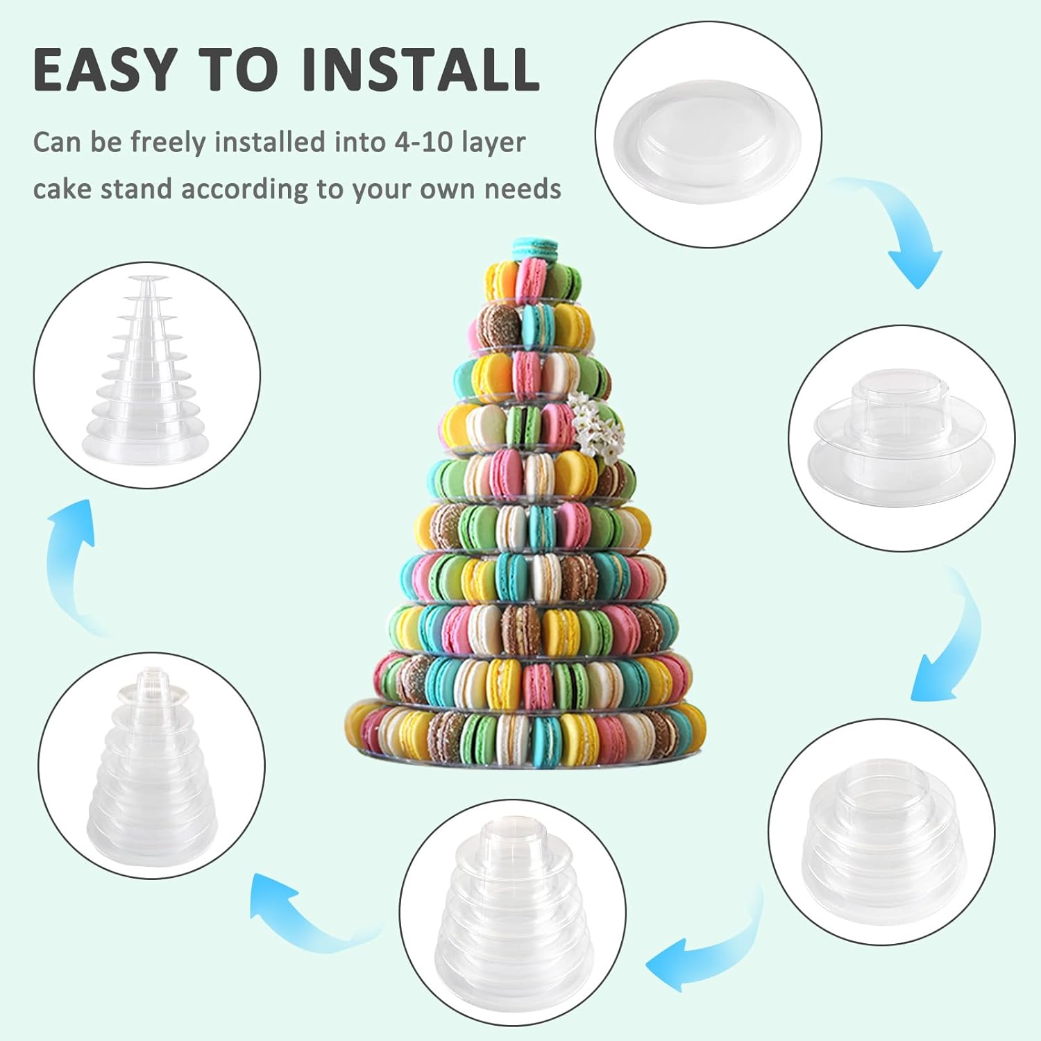 - HIGH QUALITY MATERIAL: Macaron tower cake stand are made from high-quality PVC plastic, durable and compact structure. The individual clear macaron display stand can simple assembly and disassemble 2 or 10 layers according to your needs, It can be assembled in under 30 seconds, without any tool and can stay stable without wobbling.