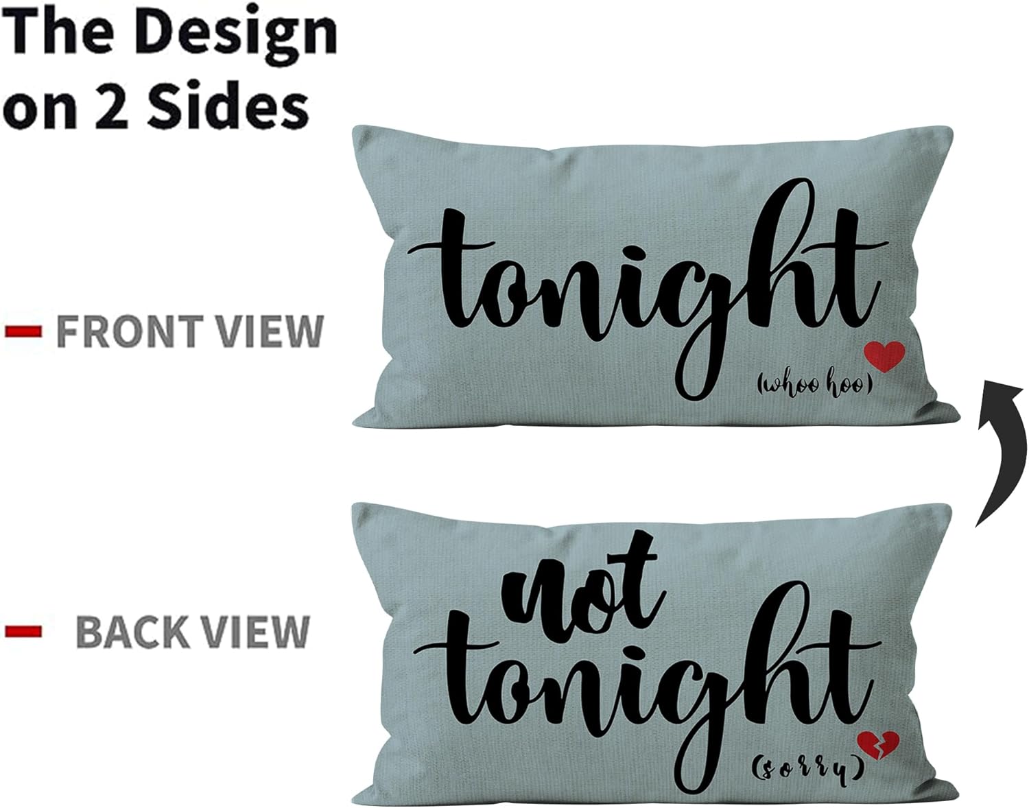 - Dual-sided Design: Enjoy the versatility of two charming patterns – "Tonight" and "Not Tonight." Playfully set the mood by flipping the pillow to match your desires, adding a touch of fun to your bedroom or sofa.