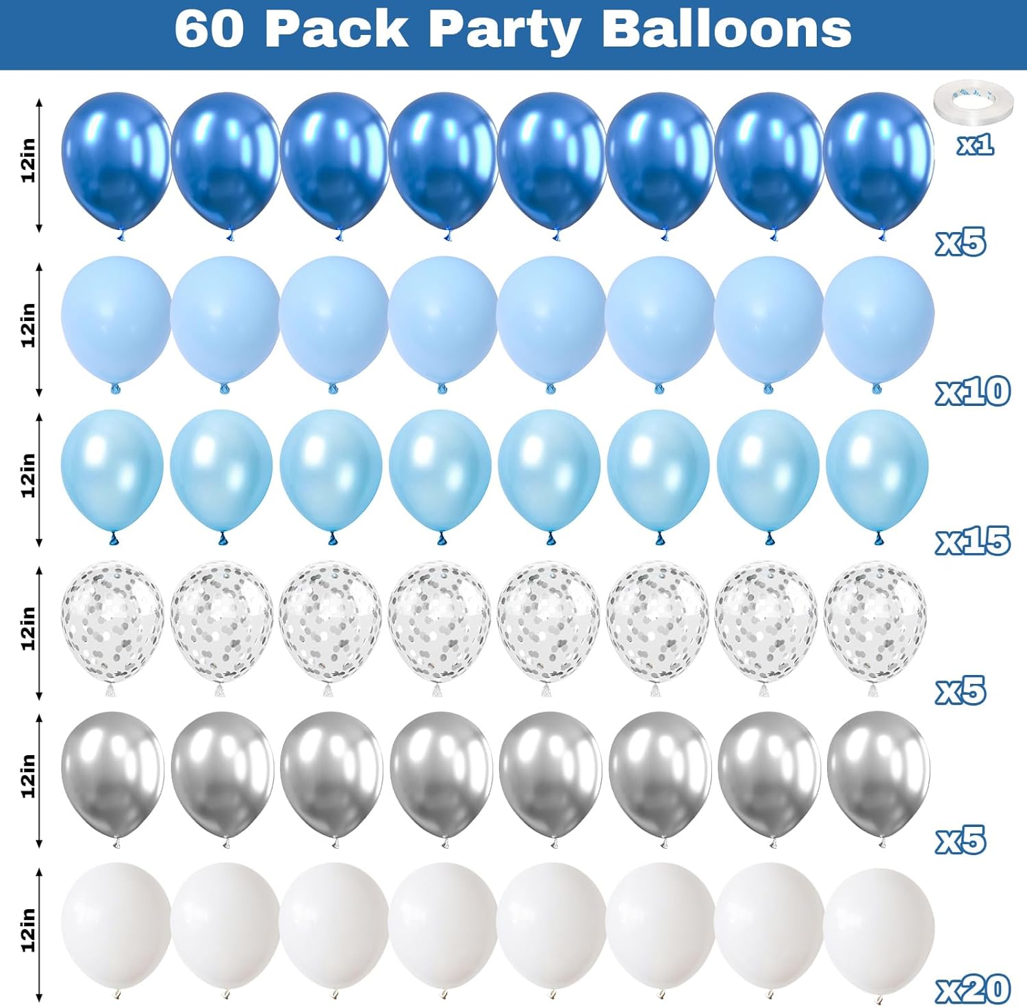 - ✨ Blue White Balloons: Our package includes 60pcs 12inch latex balloons (10pcs baby blue balloons, 15pcs pearl light blue balloons, 5pcs metallic blue balloons, 5pcs metallic silver balloons, 5pcs silver confetti balloons, 20pcs white balloons) and 1pc balloon ribbon. Perfect for upscale events, birthday, or any occasion where elegance is key. Elevate your decor with these sleek and polished light blue white balloon that will leave a lasting impression on your guests.