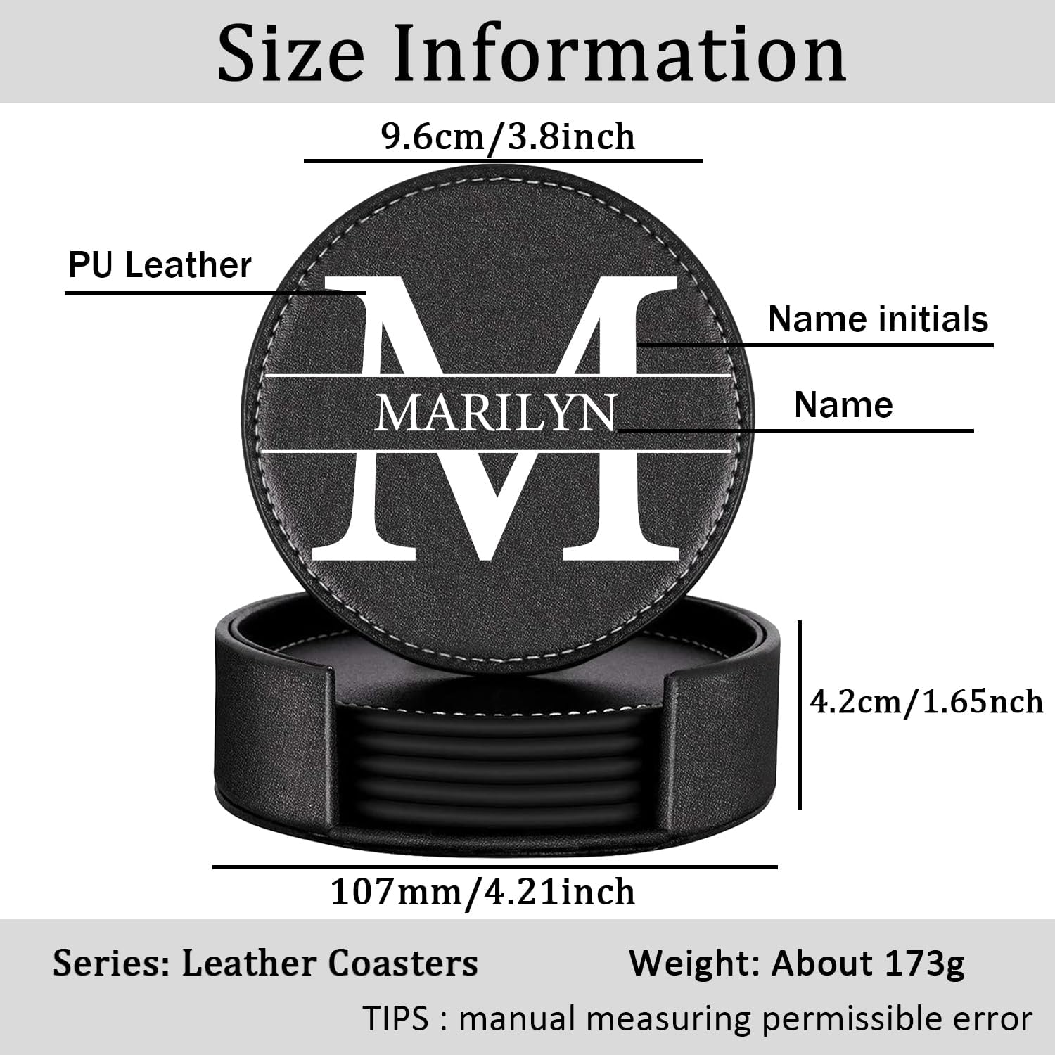 Custom Coasters Set of 6, Personalized Leather Coasters for Drinks with Holder, Customized Coasters Name, Photo, Logo for Coffee Table Bar Wine Cup Housewarming