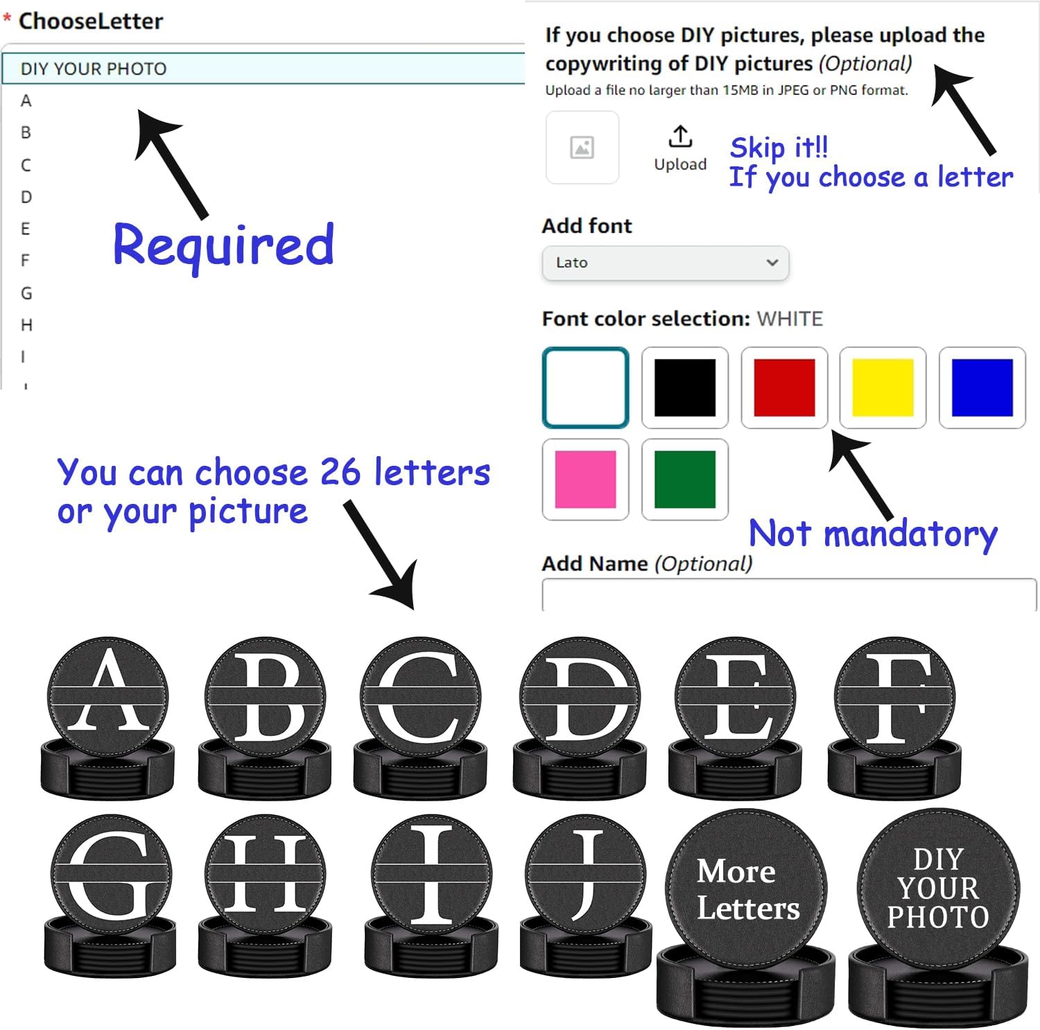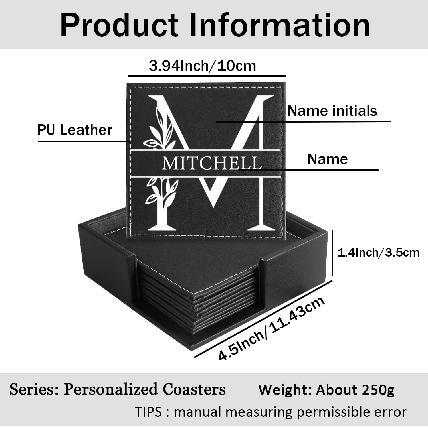Custom Coasters Set of 6, Personalized Leather Coasters for Drinks with Holder, Customized Coasters Name, Photo, Logo for Coffee Table Bar Wine Cup Housewarming