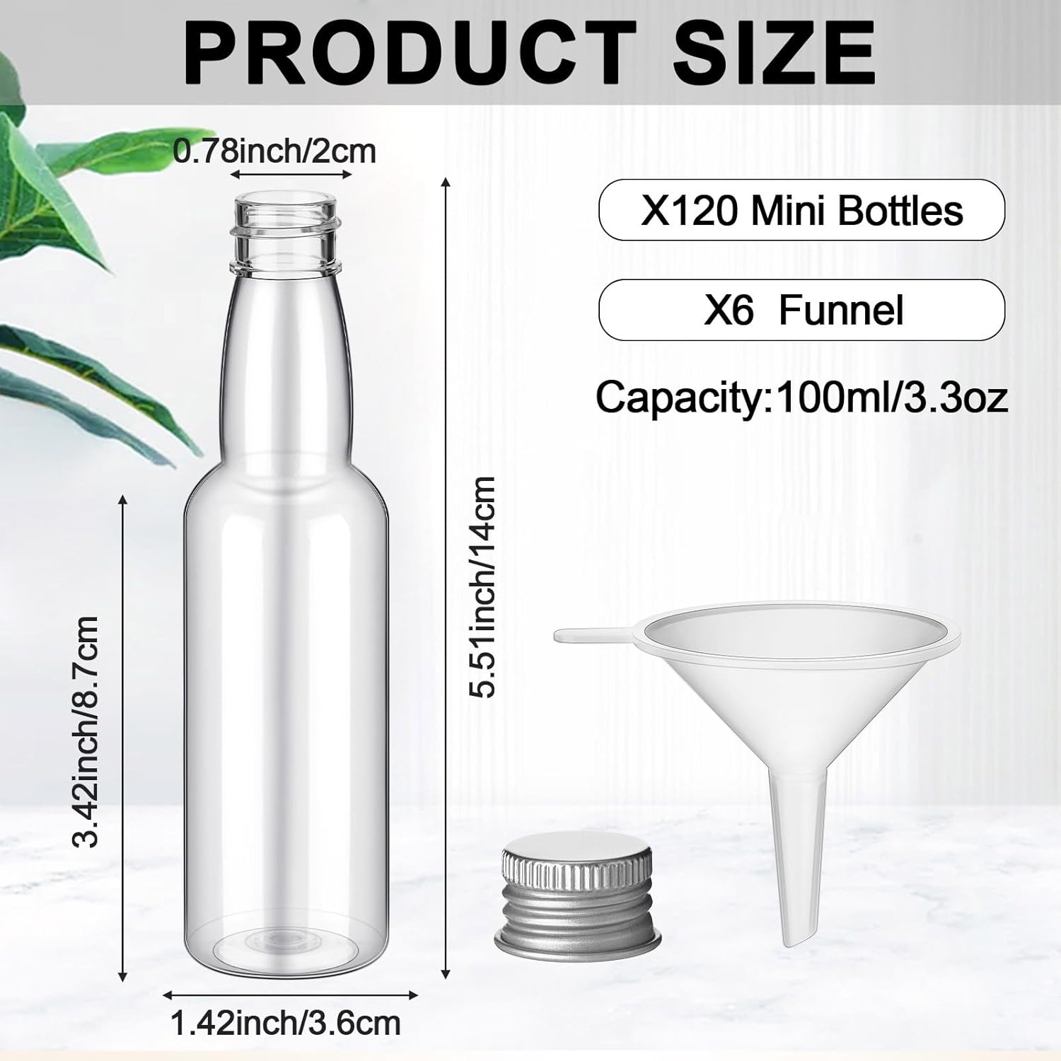 120 Pcs Mini Liquor Bottles Airtight Shot Miniature Empty Plastic Alcohol Spirit Shot Bottles with Funnels for Party Favors, Weddings(3.3 oz,Silver)