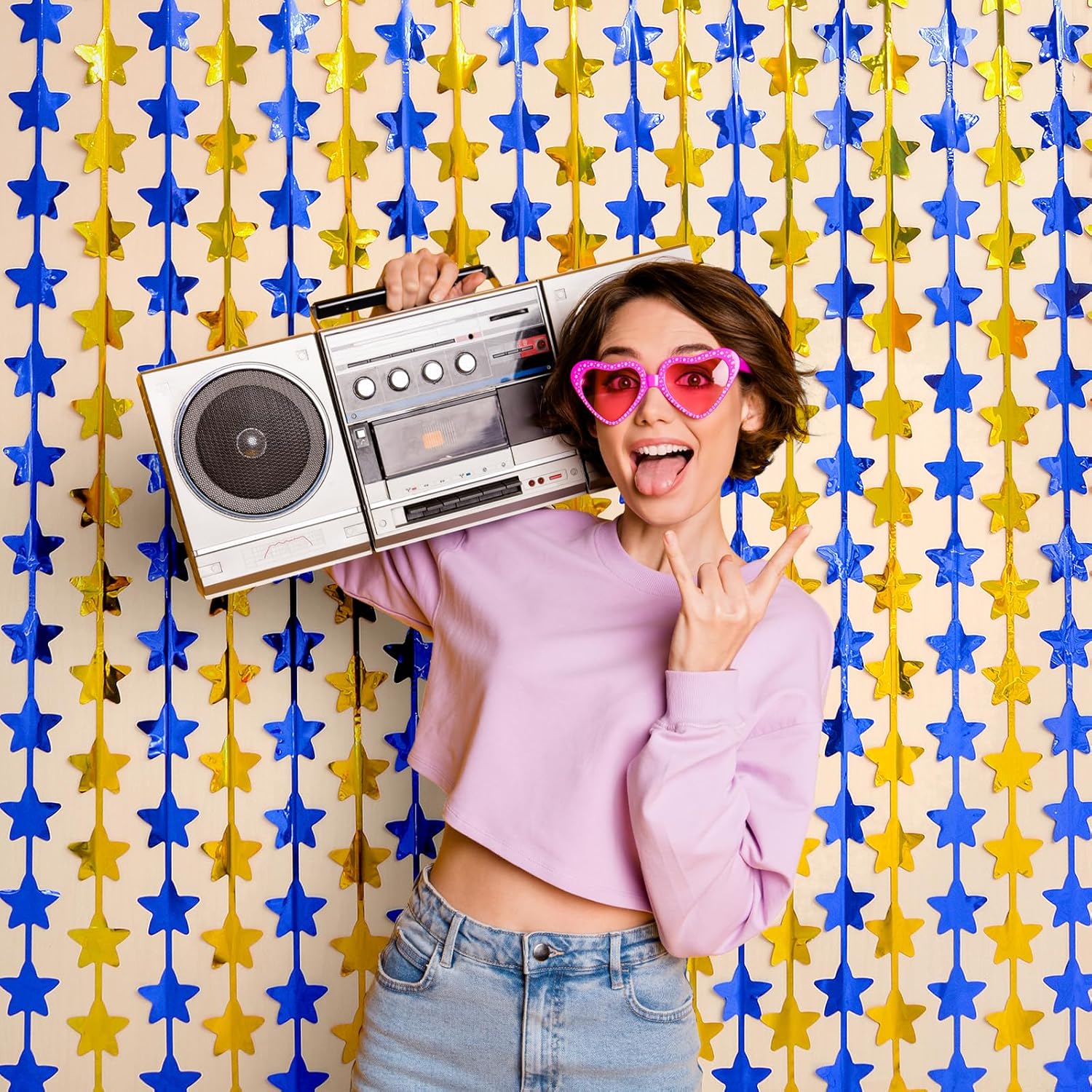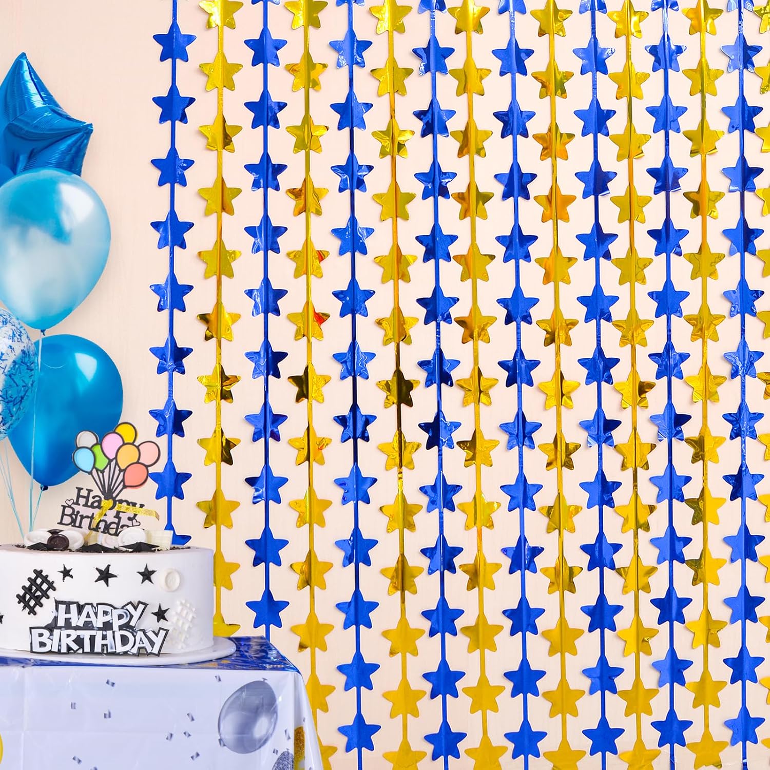 - πγ TINSEL MATERIAL γ: These blue and gold star metallic foil fringe curtains are made of tinsel. They are lightweight and durable fringe curtains. These high-quality fringe curtains are tough, unbreakable, and can be used for a long time.