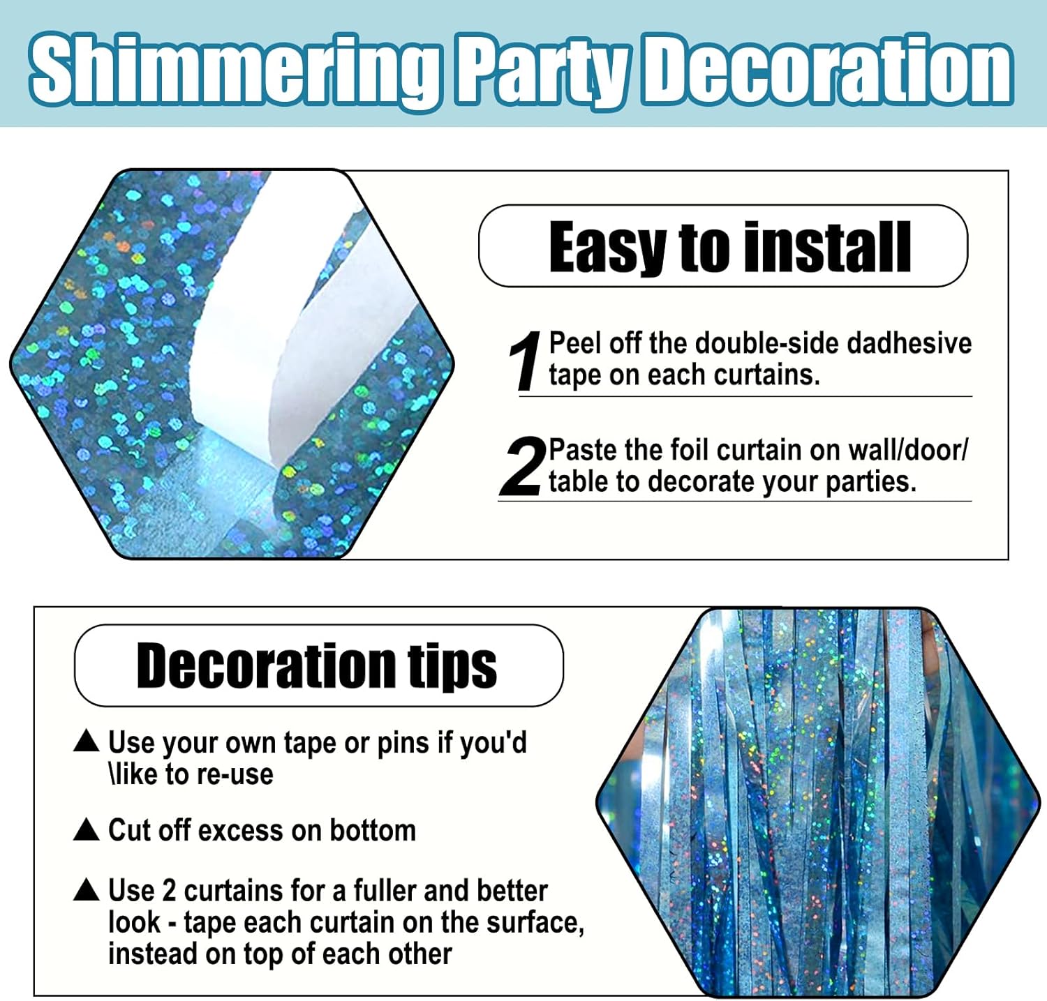 - 3.28Ft x 8.2Ft Feet | Vibrant Shiny Streamers : This sparkling tinsel blue fringe curtain is large size of 3.28ft x 8.2ft feet, pack of 3. Made of aluminium foil. This decorations for party backdrop will radiates laser like shine. and this will be a perfect party backdrop for the photo booth you had prepared for your friends and kids.