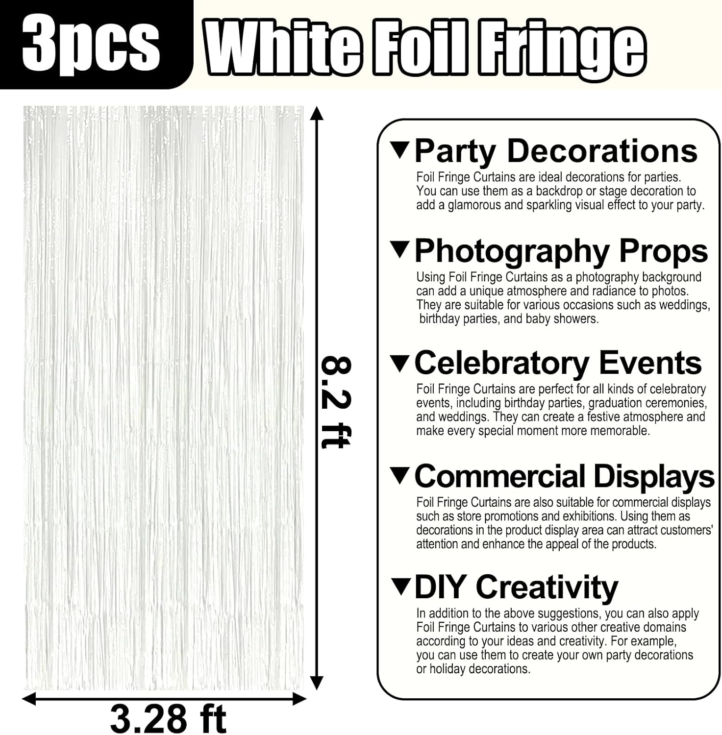 3 Pack White Foil Fringe Curtain Backdrop, 3.28Ft x 8.2Ft Metallic Tinsel Foil Fringe Streamer Curtains for Photo Booth, Mother's Day, Easter, Birthday, Wedding Party Decorations