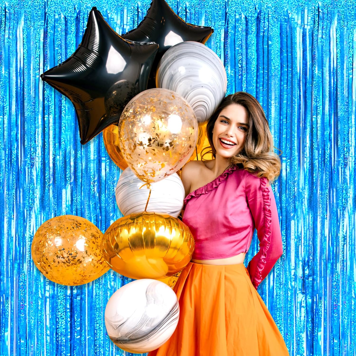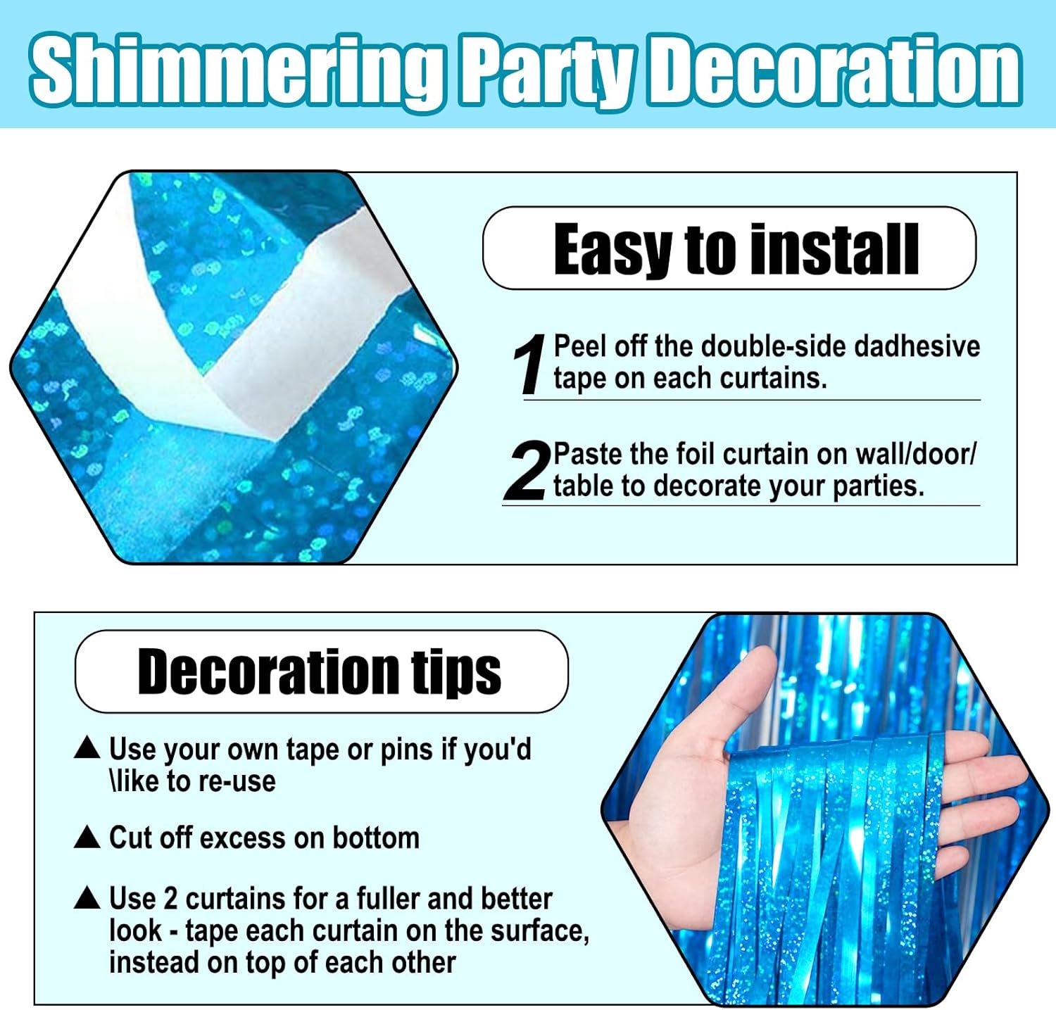 - Easy To Assemble | Strong Adhesive | Not Easy Fade : The foil fringe curtain backdrop party decorations come with double-sided adhesive tape, easy to use, just tear off the back of adhesive tape, then paste this streamers backdrop curtains on the top of wall, window, table, or as door fringe decoration.