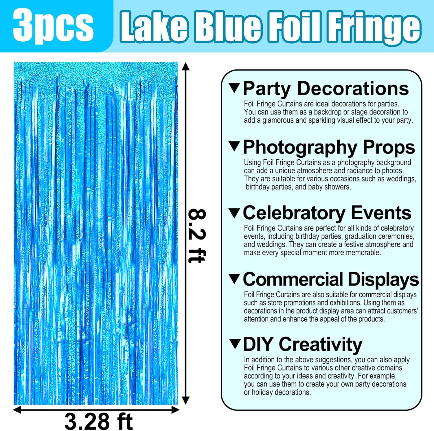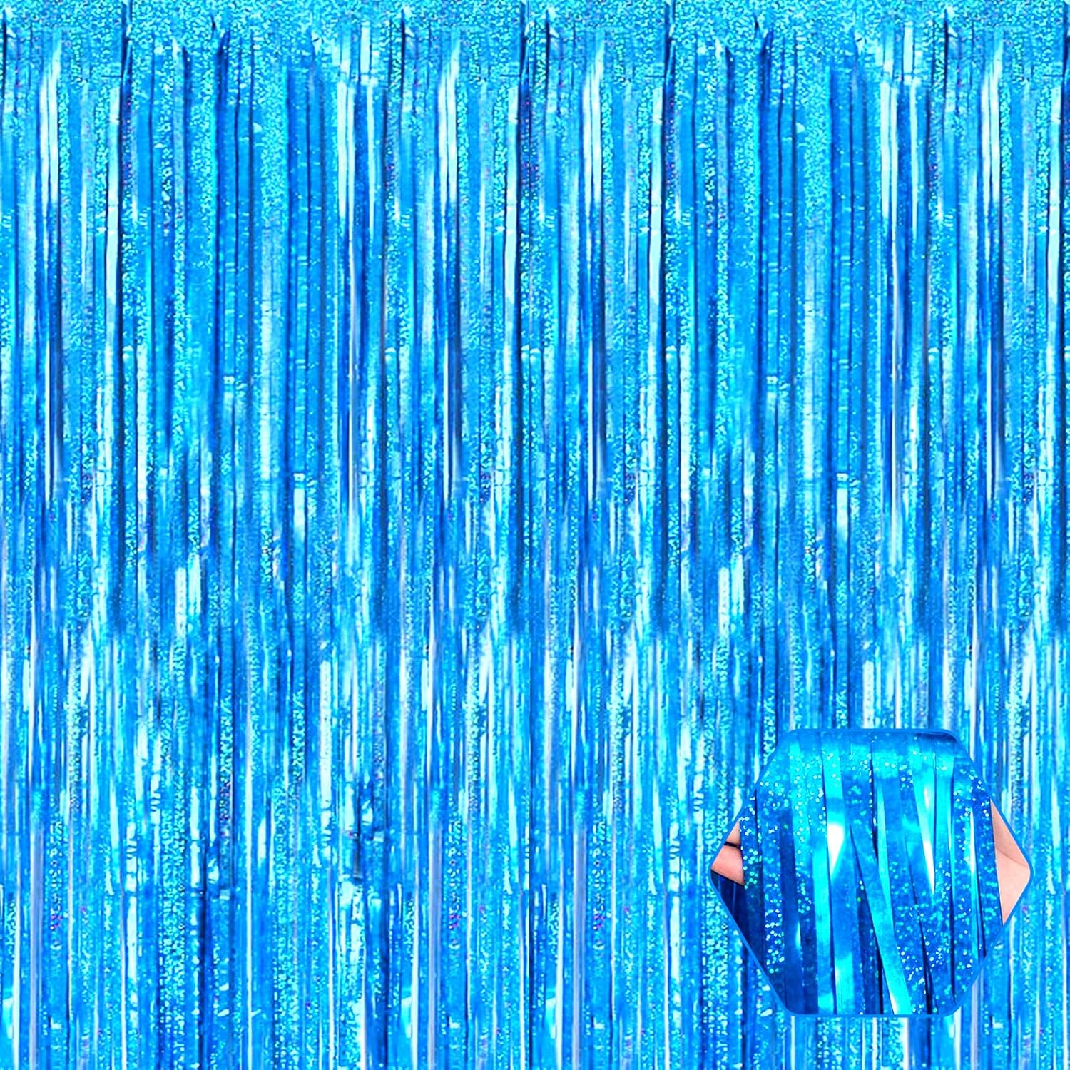- 3.28Ft x 8.2Ft Feet | Vibrant Shiny Streamers : This sparkling tinsel blue fringe curtain is large size of 3.28ft x 8.2ft feet, pack of 3. Made of aluminium foil. This decorations for party backdrop will radiates laser like shine. and this will be a perfect party backdrop for the photo booth you had prepared for your friends and kids.