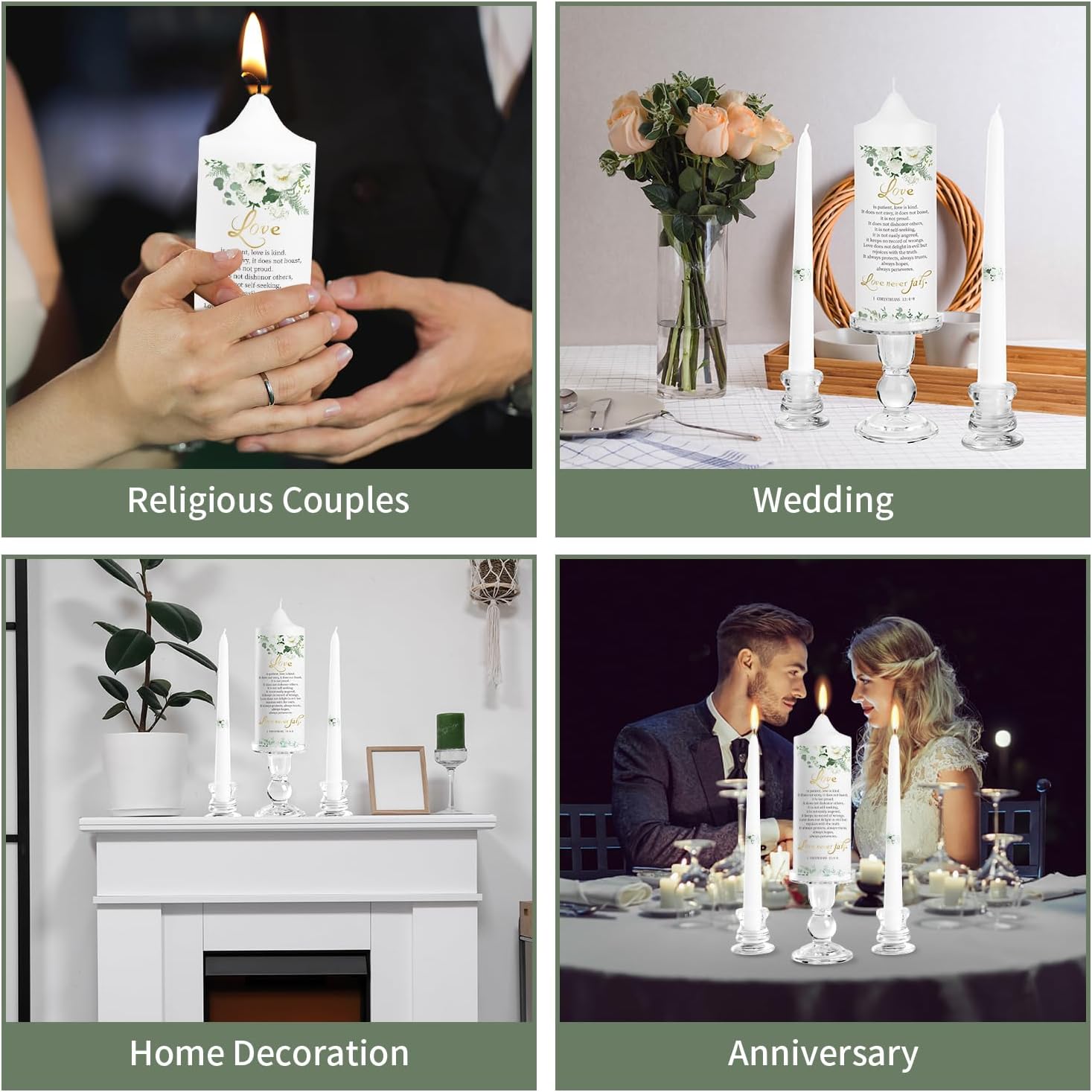 - ⭐Easy Matching Glass Candle Holders: Say goodbye to the hassle of finding the right size crystal candle holders. Our Wedding Centerpieces Set includes three matching glass candlestick holder that fit perfectly to the size of the decorative baptism candle. These taper candle holders ensure a secure and stable presentation, allowing you to focus on the meaning of your wedding bible ceremony without worry.