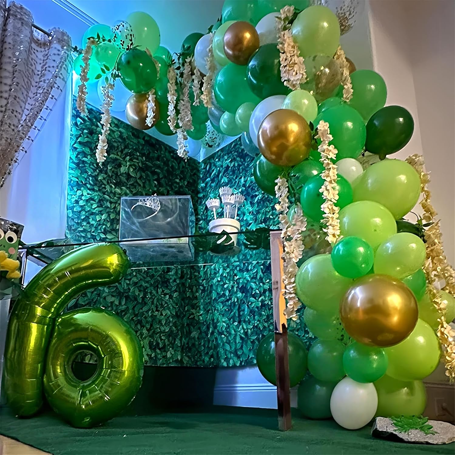 - ๐ Green Gold Confetti Balloons - You will get 35 pieces 12 inch latex party balloons set, includes matte dark green 8pcs, pearl light green 7pcs, matte white 7pcs, metallic gold 8pcs, gold confetti 5pcs, come with 1pc gold balloon ribbon. Perfect for boys girls jungle dinosaur birthday baby shower graduation party decorations supplies.