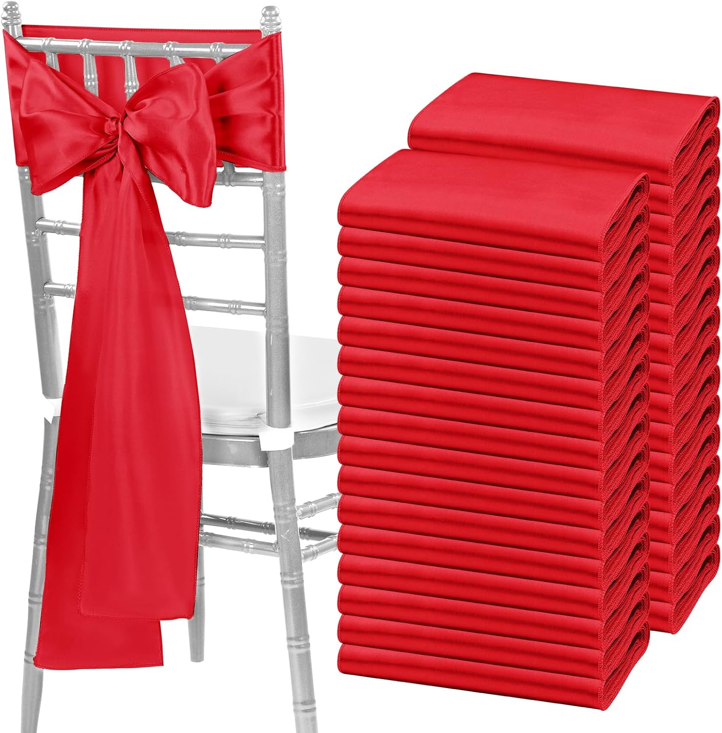 - š¬ćPackage IncludećPack of 120 satin chair sash.Size: 7" x108" or 275cm(l) x 17cm(w). Each package includes chair sashes only, without chair covers.These chair ties bring a modern twist to your chair's settings and let your chairs sparkle brightly. Satin sashes can be tied into wedding chairs, draped across any decoration, or used as attractive table runners.