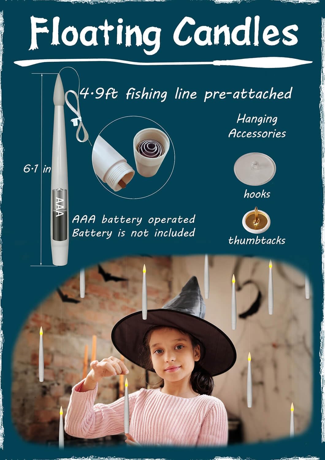 - Super easy to hang: 4.9ft long clear fishing line (barely visible) pre-attached on the tip of each candle, can hang down straight instead of being at an angle, and it's long enough to accommodate whatever your length needs are. You can hang candles onto the ceiling, window, wall with thumbtacks or stick hook, or just attach to the Christmas Tree.