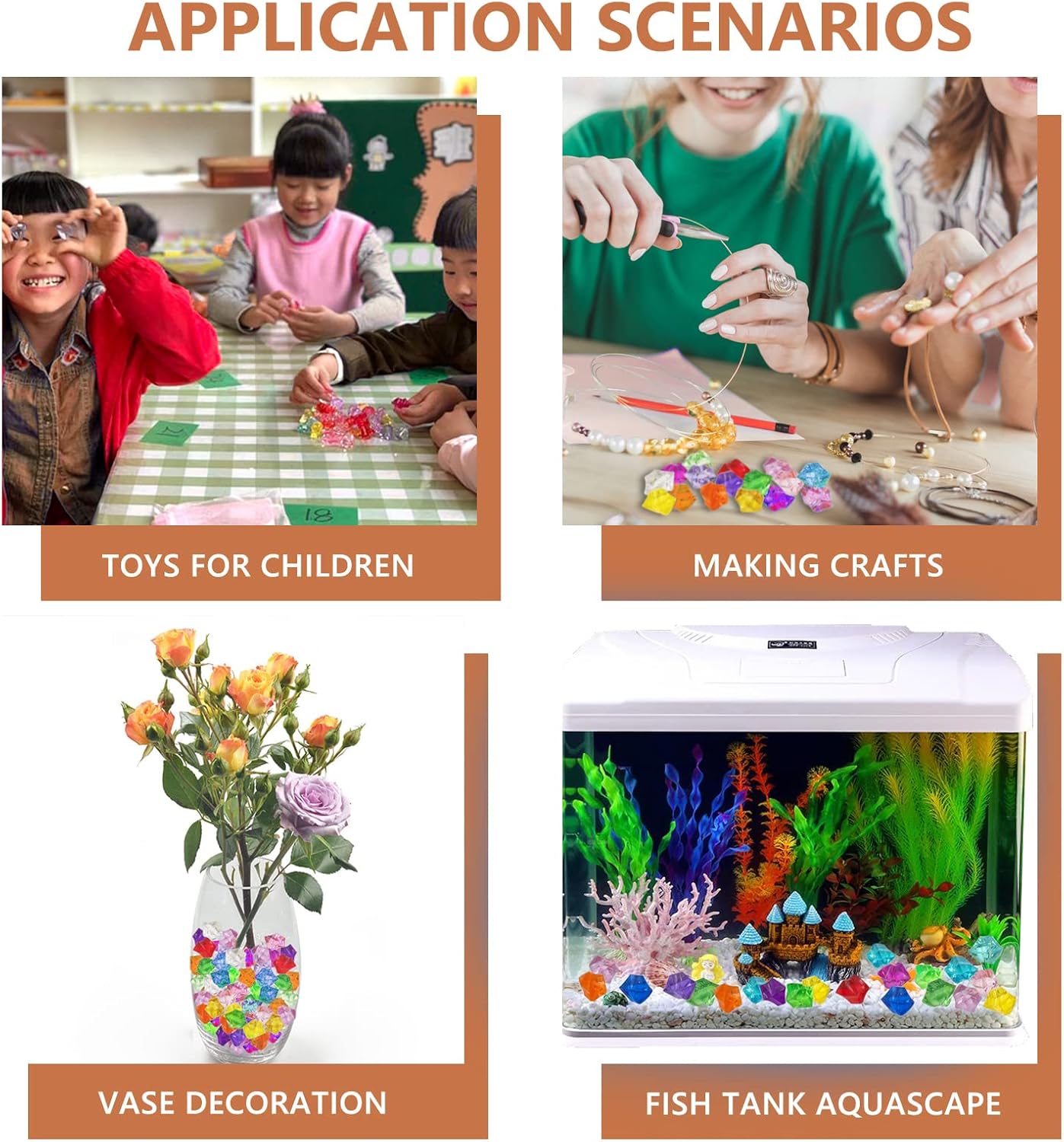- Widely in use: Our fake crushed ice can be widely used in Vase Fillers, Table Scatter, Party Favor, Wedding Decoration, Photography Props, Food Display, Fish Tank Decorations, DIY Arts & Crafts, etc.