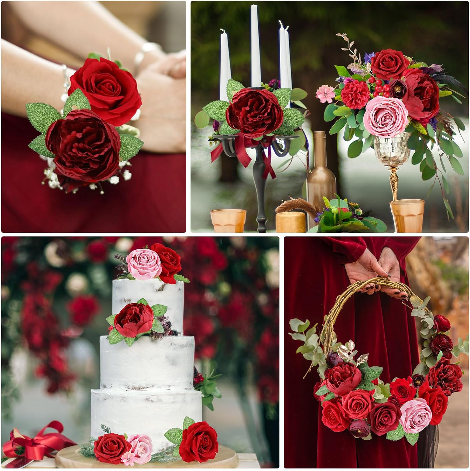 AmyHomie Red Artificial Flowers Combo Silk Mix Peony Rose Fake Flowers w/Stem for Valentine's Day DIY Wedding Bouquets Centerpieces Table Fall Decor Party Bridal Baby Shower Home Decorations