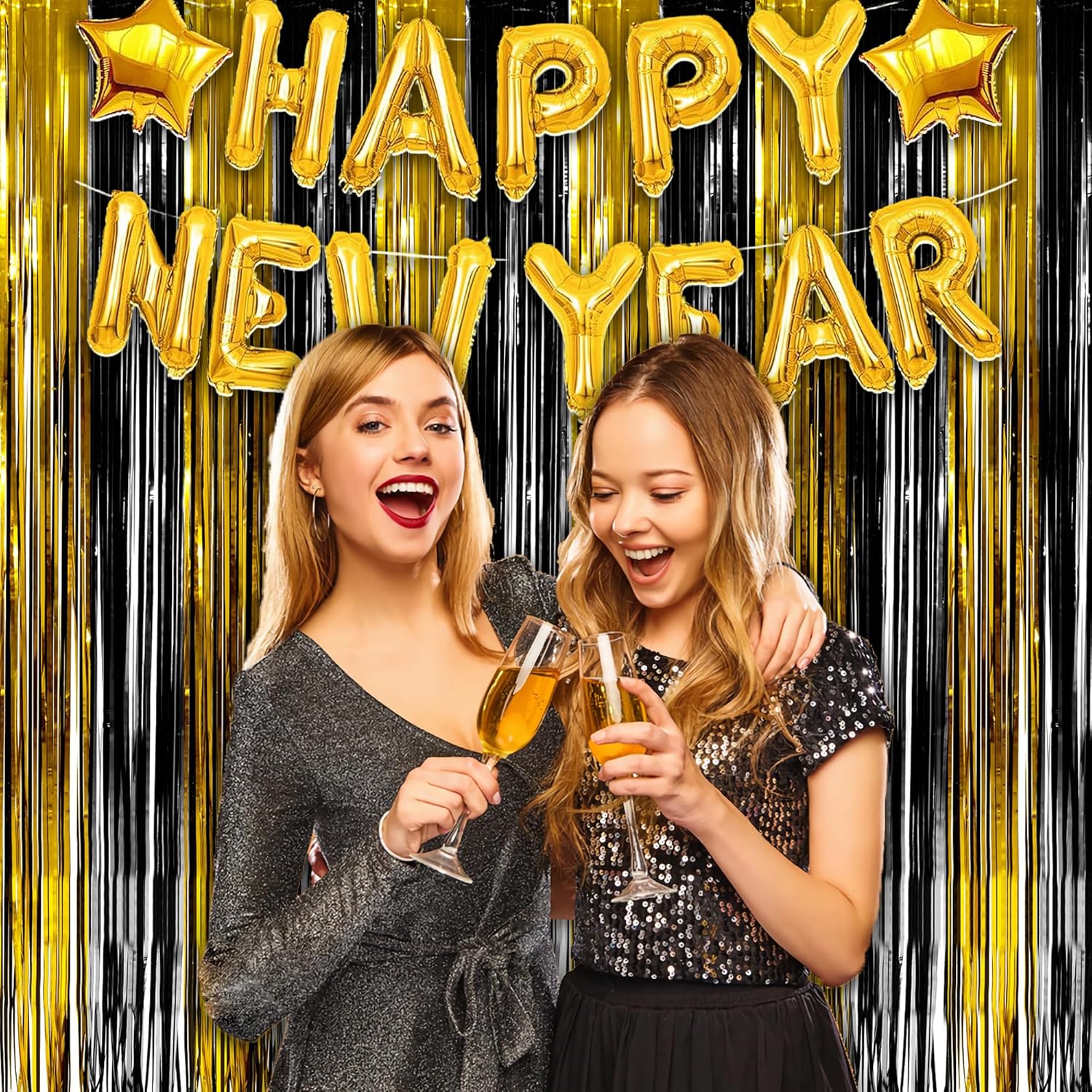 Black and Gold Party Streamers Decoration - GREATRIL Foil Fringe Backdrop for 2026 NYE/Anniversary/Farewell/Cocktail/Prom/EID/Birthdays - 3.2ft X 8.2ft - 2 Packs