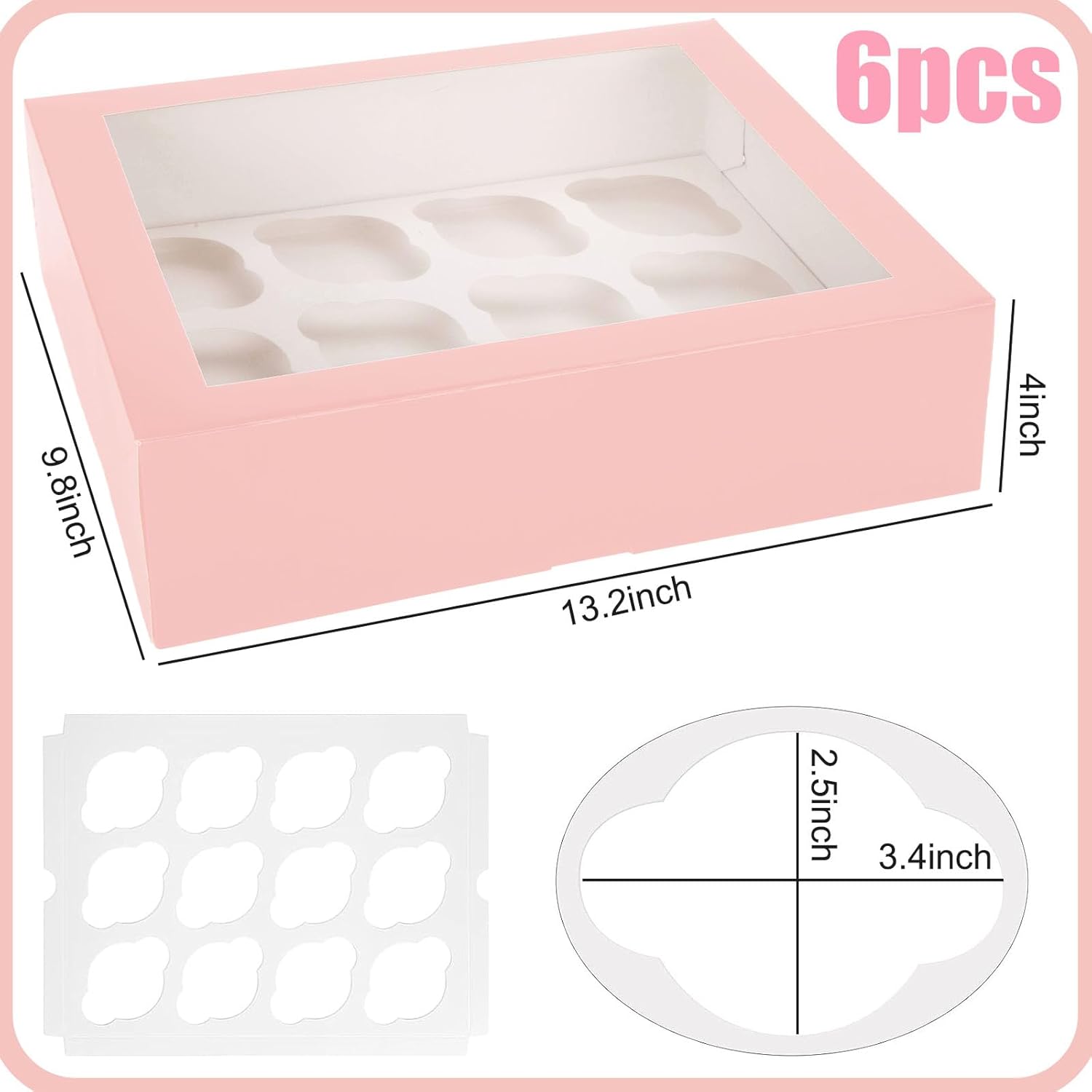 - Easy Setup: Includes 6 pink cupcake boxes and 6 matching inserts. Our cupcake containers size when assembled: 13.2" x 9.8" x 4". Ships flat for easy storage and folds quickly along pre-scored lines—no tape or glue required