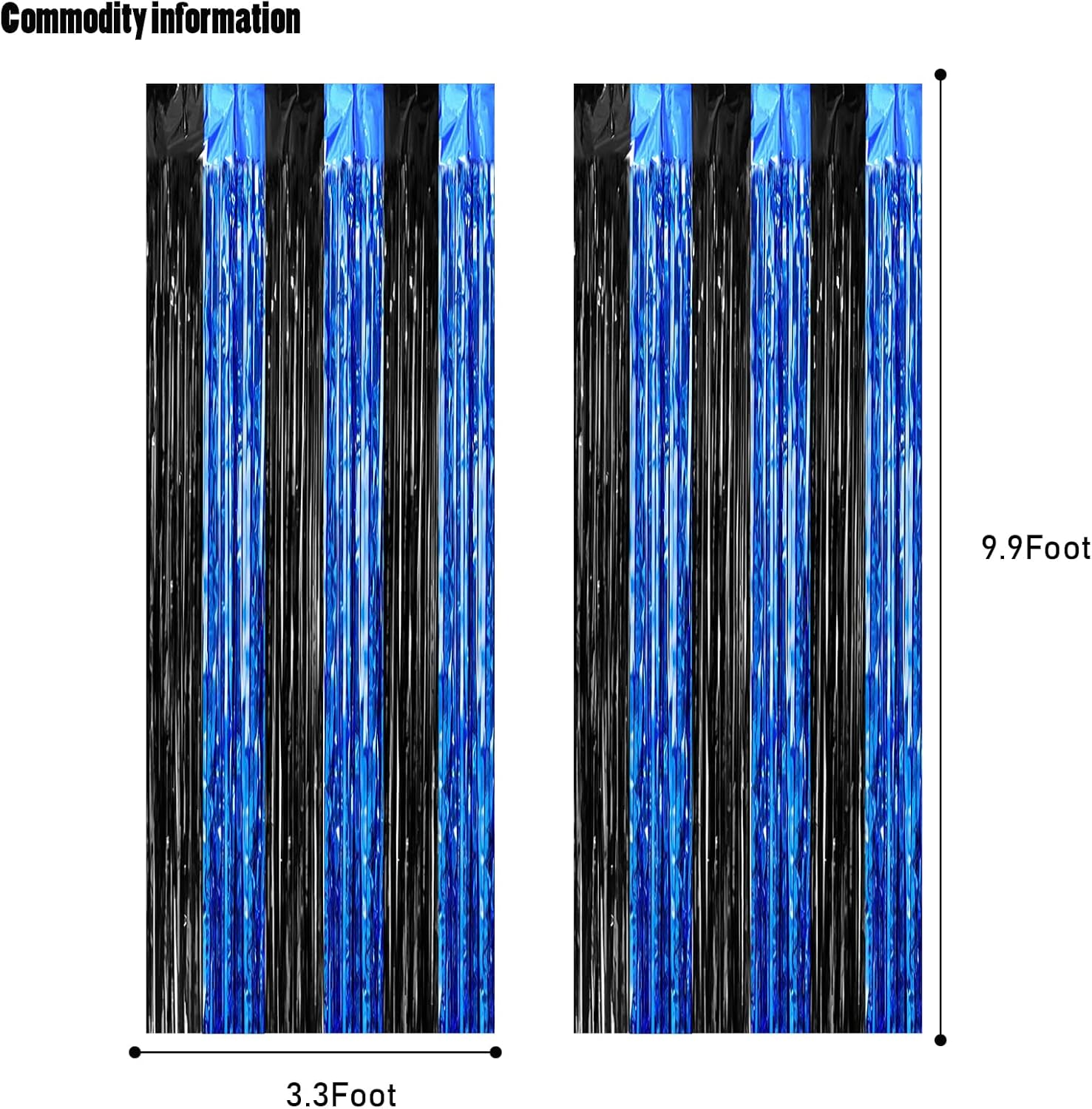 - 🎉PACKAGE INCLUDED : 2 pack of blue and black foil fringe curtains, the size of each tinsel curtain is 3.3 ft x 8.2 ft, enough length for hanging on a door or covering a wall fully, suitable for any parties.