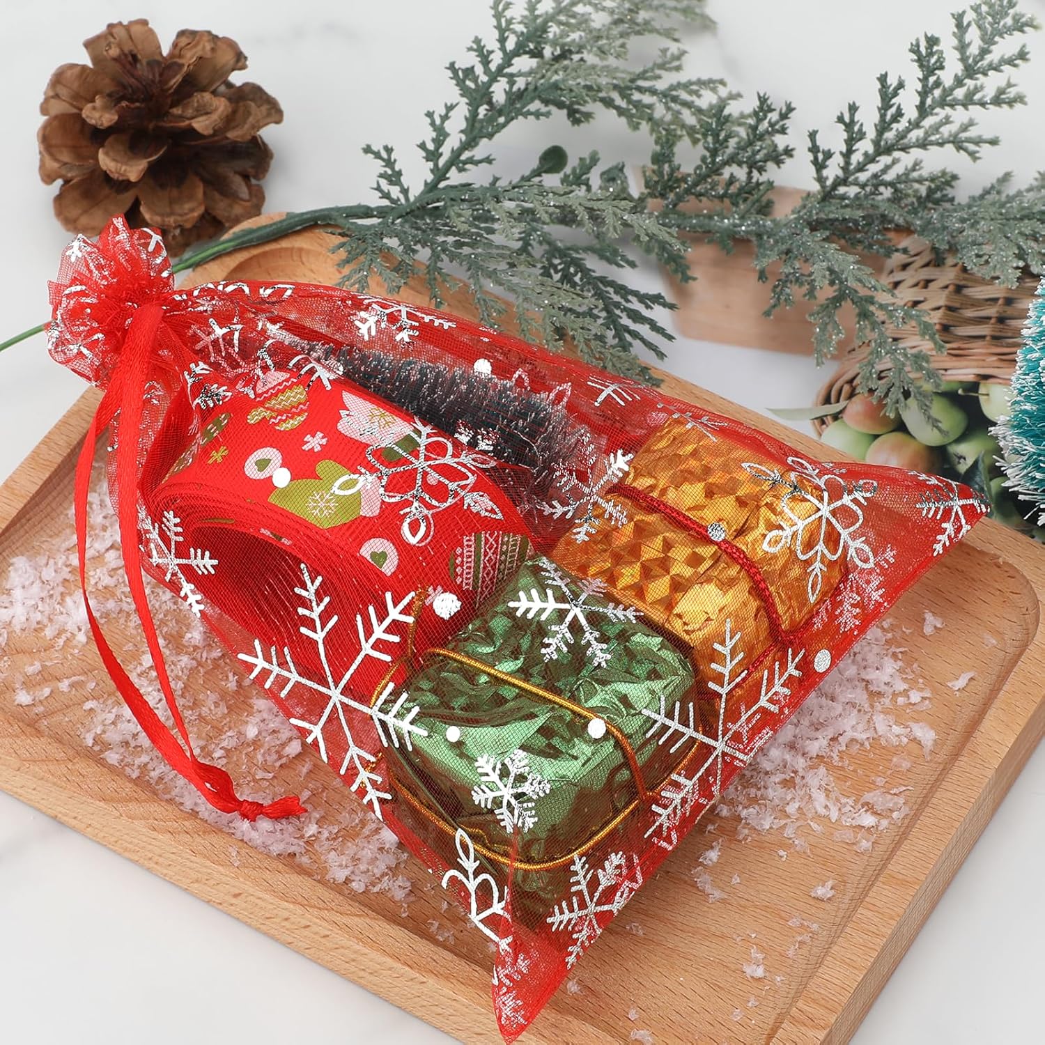 jijAcraft 5x7 Inch Christmas Organza Bags - 50Pcs Red Snowflake Gift Bags with Drawstring, Xmas Party Favor Sheer Mesh Pouches for Winter Gift, Candy, Jewelry Bag
