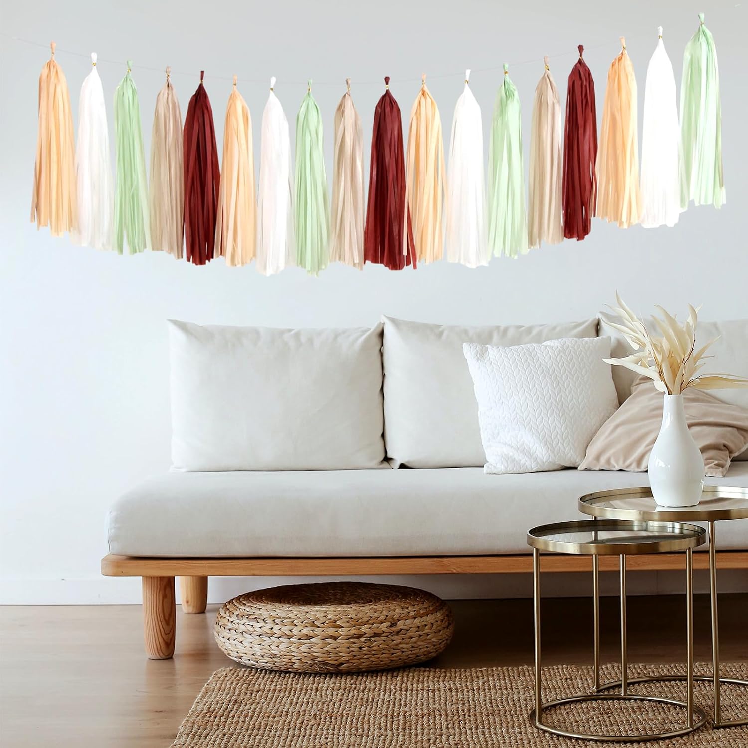 - 【Garland includes】25tassels,5pcs sage green tassel garland, 5pcs white tassel garlands, 5pcs champagne garlands,5pcs burgundy garlands. Each tassel is about 14" long after assembled. And each garland comes with a 10ft long free String for hanging these tassels.