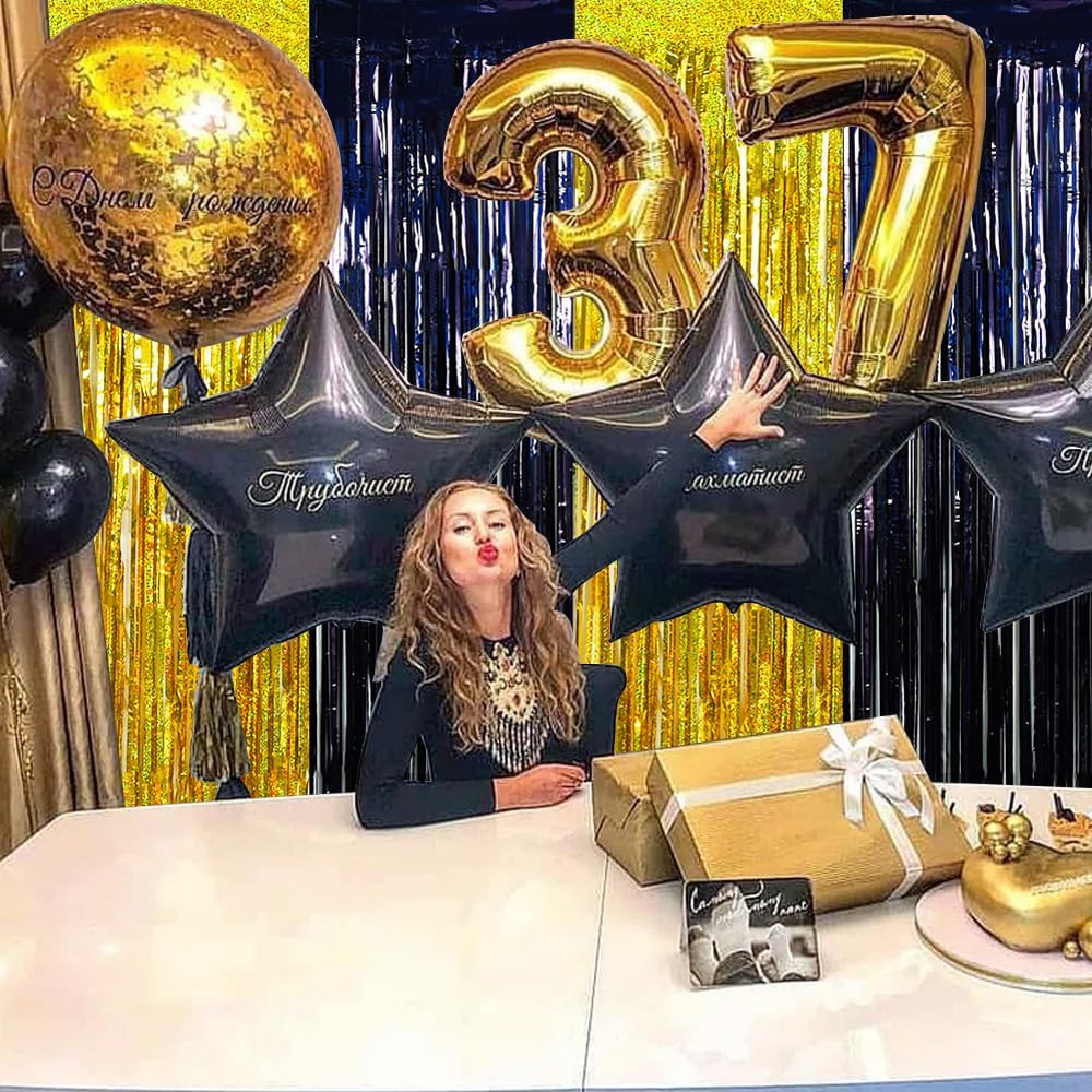 - Extra Large Size Party Streamers Size - The 4 pack streamers curtain(2PCS X Gold Streamers& 2PCS X Black Streamers) size is 8.2Ft(Length) X 3.28Ft(Width). The fringe backdrops are perfect to make an elegant entrance curtain for your party decorations.