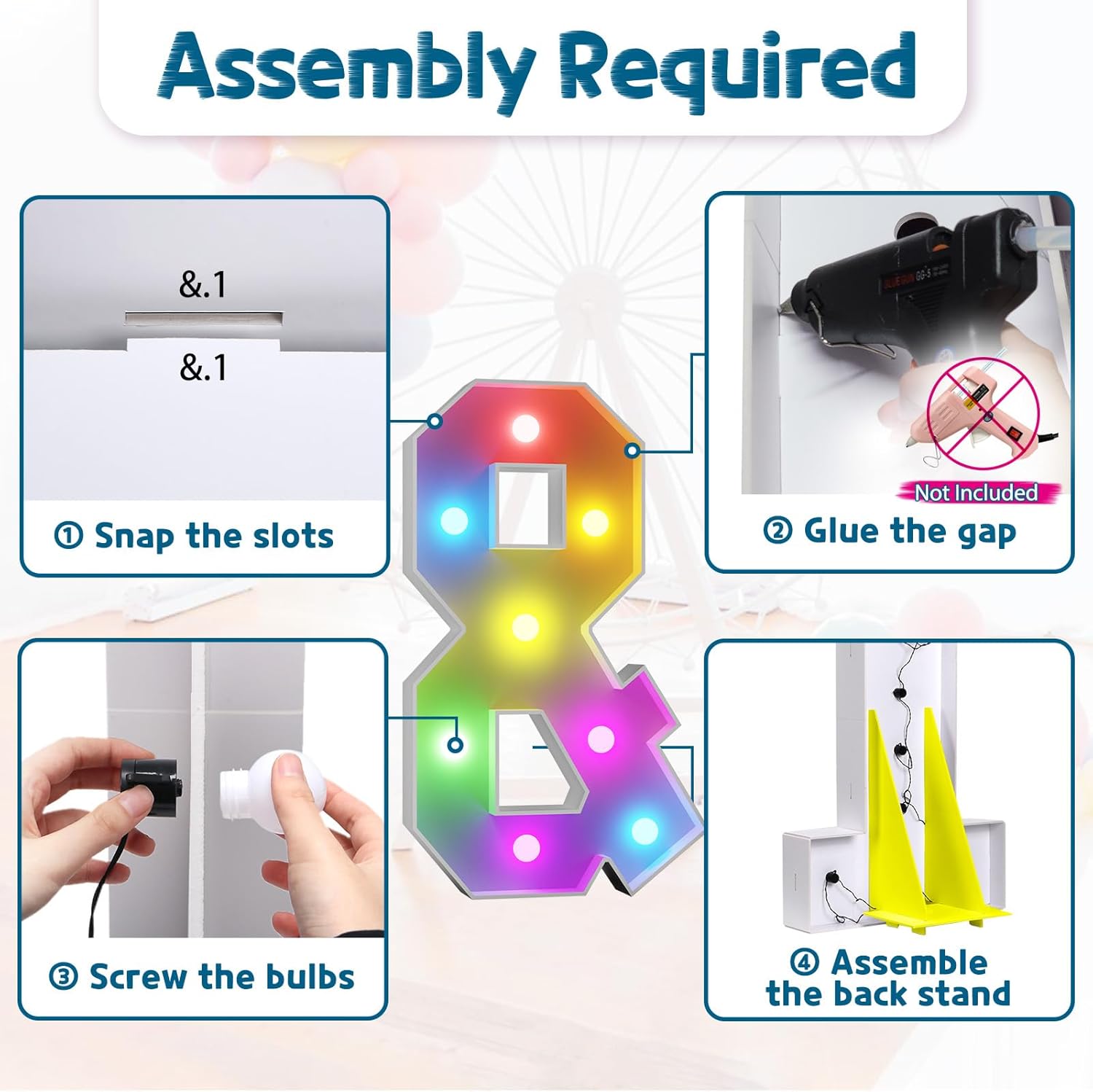 - Assembly Required. To assemble the light up numbers and letters, a hot glue gun is necessary. We have conveniently pre-cut the numbers into several pieces for your convenience. Simply consult the included instruction manual to easily assemble the impressive 4 ft tall and 3ft tall marquee numbers and letters using a hot glue gun.