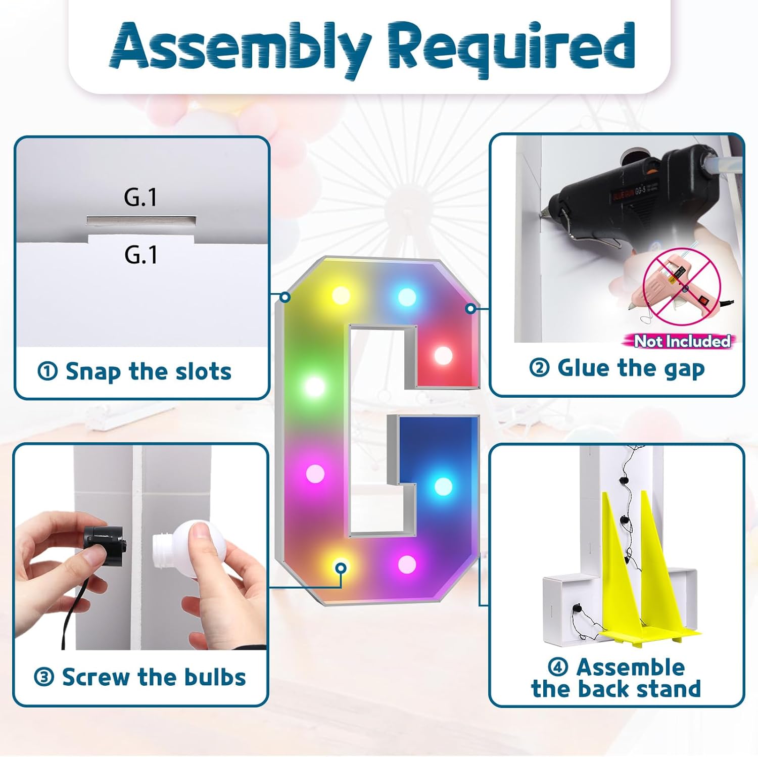 - Assembly Required. To assemble the light up numbers and letters, a hot glue gun is necessary. We have conveniently pre-cut the numbers into several pieces for your convenience. Simply consult the included instruction manual to easily assemble the impressive 4 ft tall and 3ft tall marquee numbers and letters using a hot glue gun.