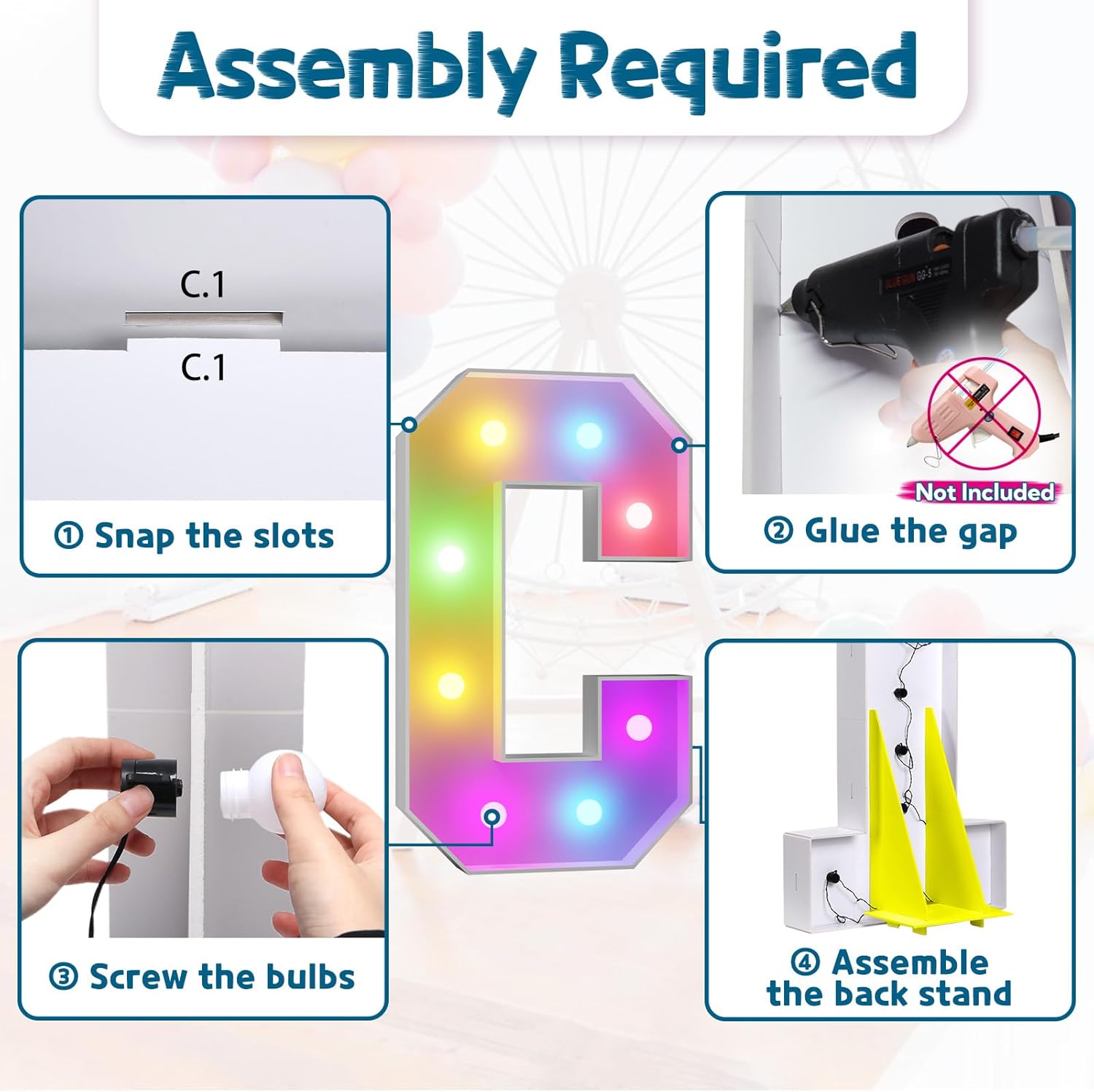- Assembly Required. To assemble the light up numbers and letters, a hot glue gun is necessary. We have conveniently pre-cut the numbers into several pieces for your convenience. Simply consult the included instruction manual to easily assemble the impressive 4 ft tall and 3ft tall marquee numbers and letters using a hot glue gun.