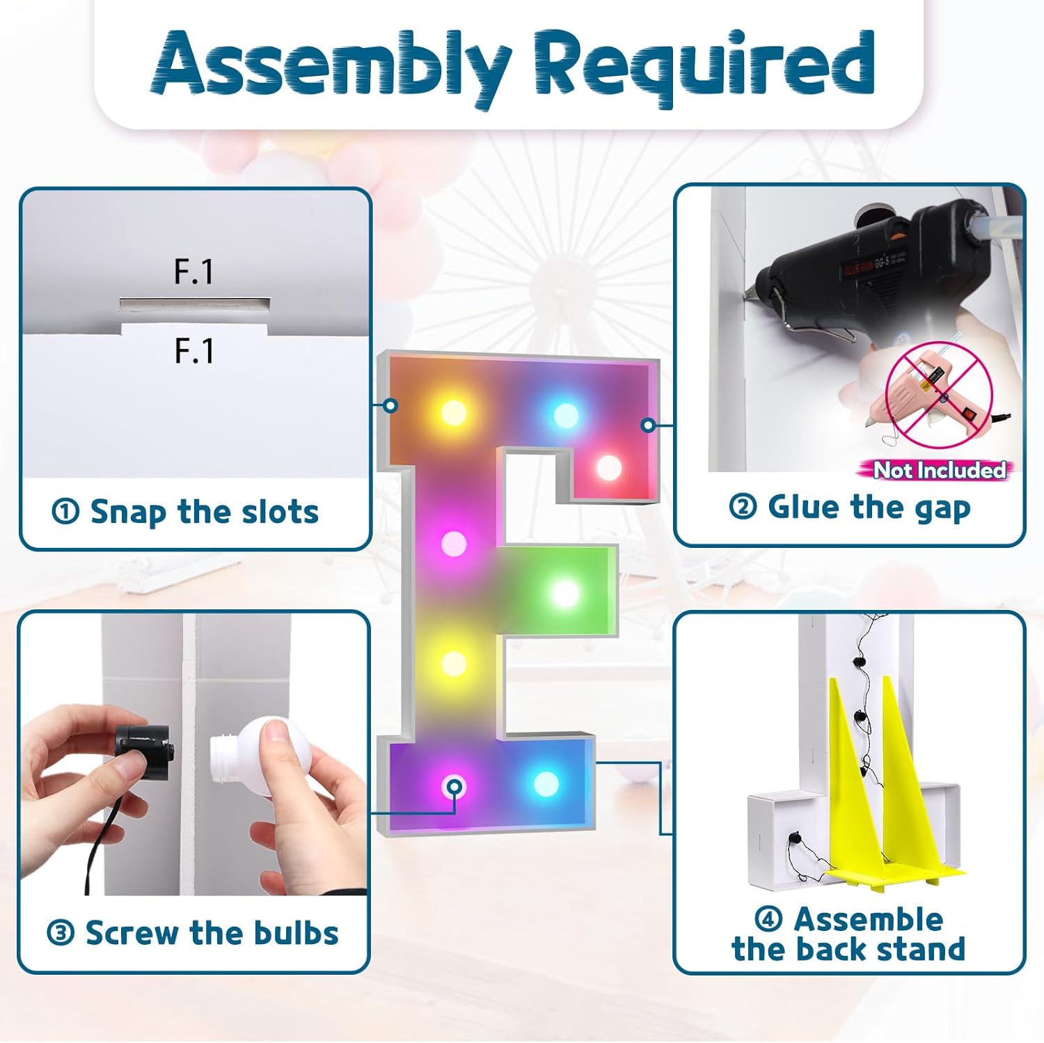 - Assembly Required. To assemble the light up numbers and letters, a hot glue gun is necessary. We have conveniently pre-cut the numbers into several pieces for your convenience. Simply consult the included instruction manual to easily assemble the impressive 4 ft tall and 3ft tall marquee numbers and letters using a hot glue gun.