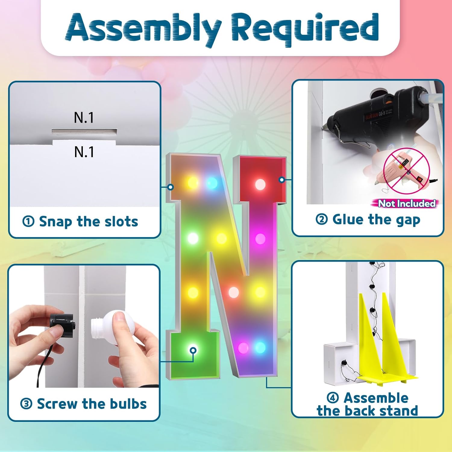 - Assembly Required. To assemble the light up numbers and letters, a hot glue gun is necessary. We have conveniently pre-cut the numbers into several pieces for your convenience. Simply consult the included instruction manual to easily assemble the impressive 4 ft tall and 3ft tall marquee numbers and letters using a hot glue gun.