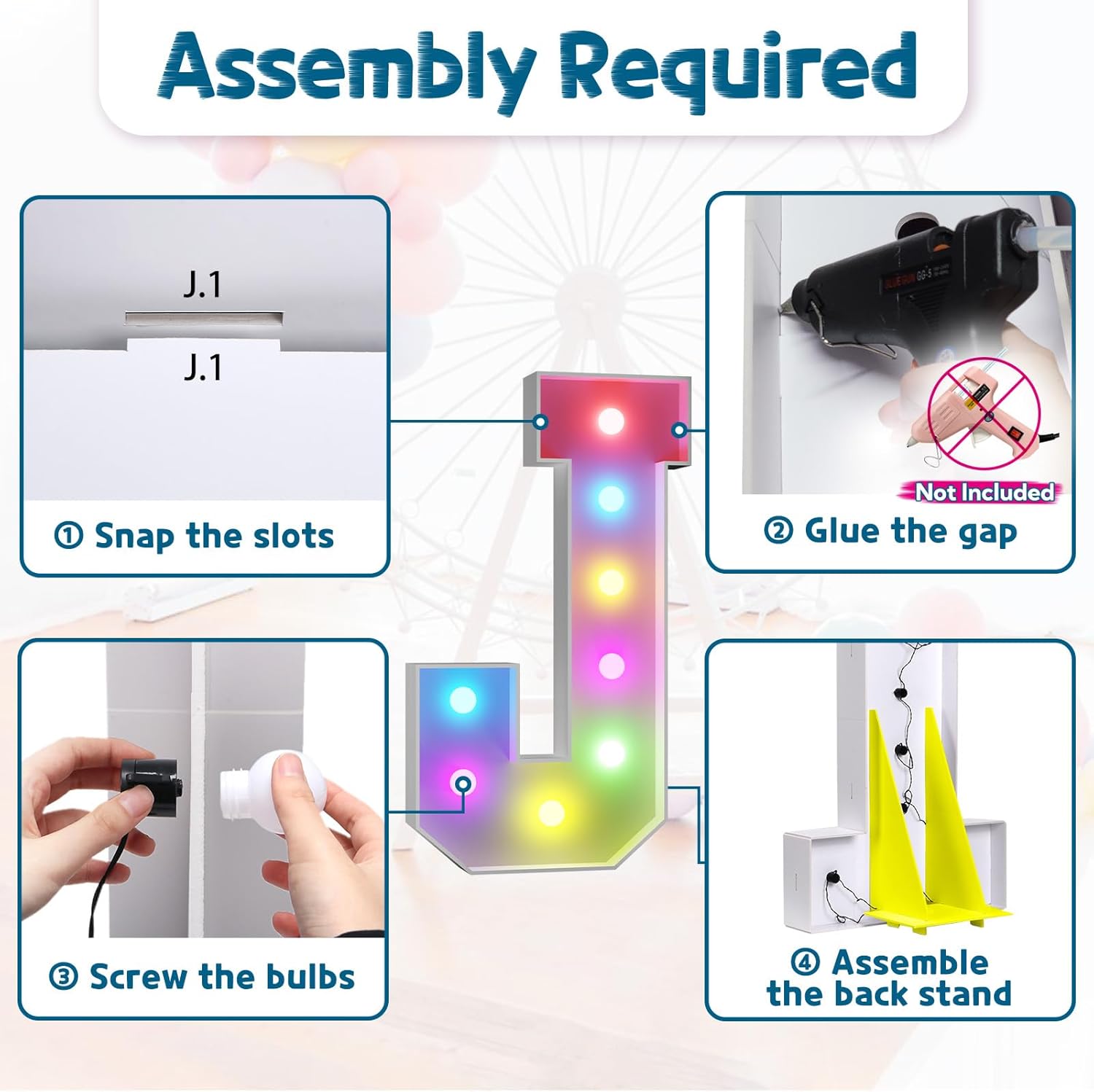 - Assembly Required. To assemble the light up numbers and letters, a hot glue gun is necessary. We have conveniently pre-cut the numbers into several pieces for your convenience. Simply consult the included instruction manual to easily assemble the impressive 4 ft tall and 3ft tall marquee numbers and letters using a hot glue gun.