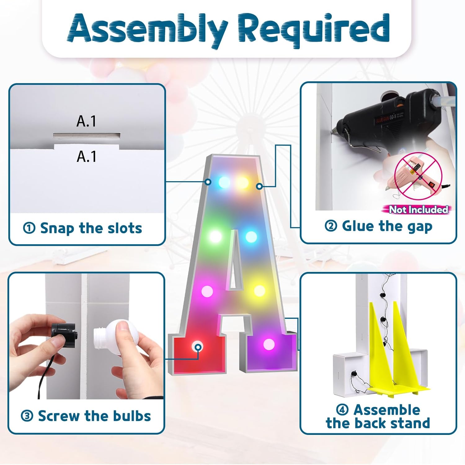 - Assembly Required. To assemble the light up numbers and letters, a hot glue gun is necessary. We have conveniently pre-cut the numbers into several pieces for your convenience. Simply consult the included instruction manual to easily assemble the impressive 4 ft tall and 3ft tall marquee numbers and letters using a hot glue gun.