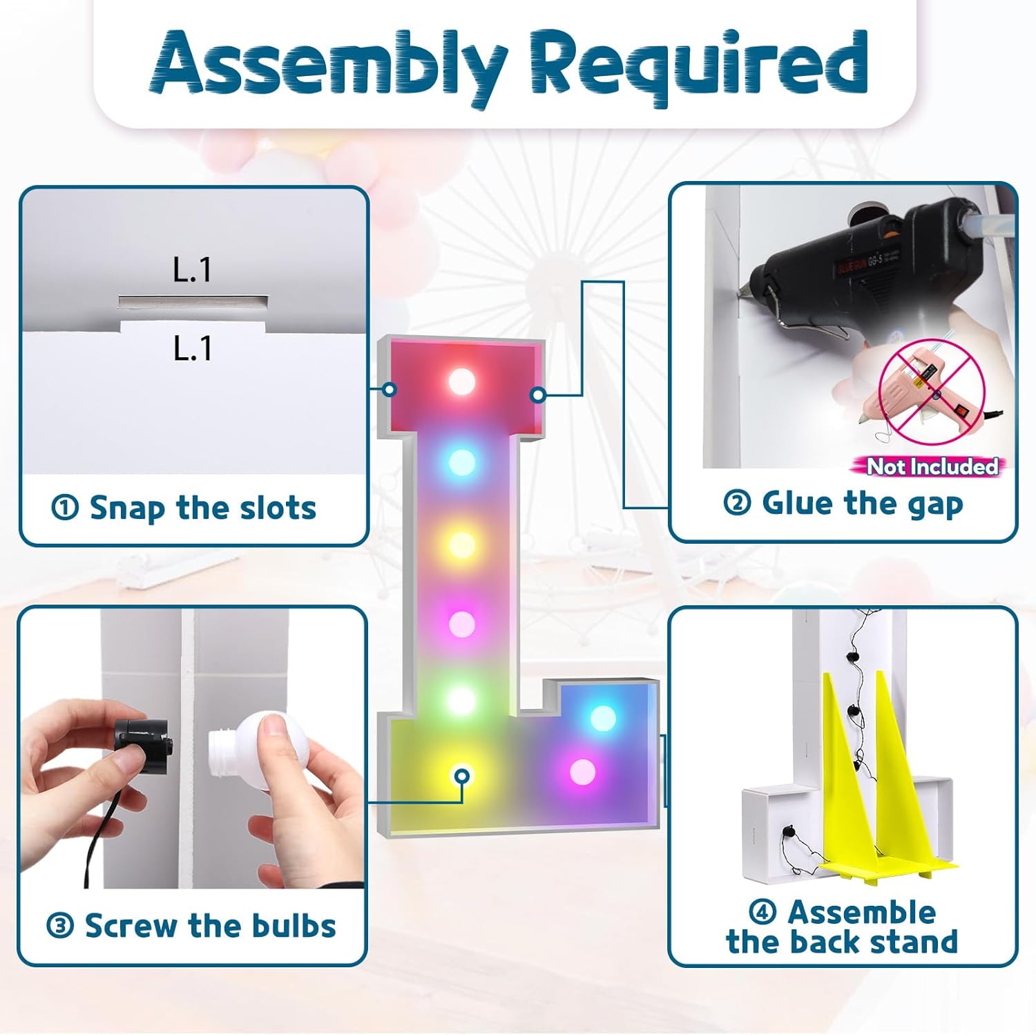 - Assembly Required. To assemble the light up numbers and letters, a hot glue gun is necessary. We have conveniently pre-cut the numbers into several pieces for your convenience. Simply consult the included instruction manual to easily assemble the impressive 4 ft tall and 3ft tall marquee numbers and letters using a hot glue gun.