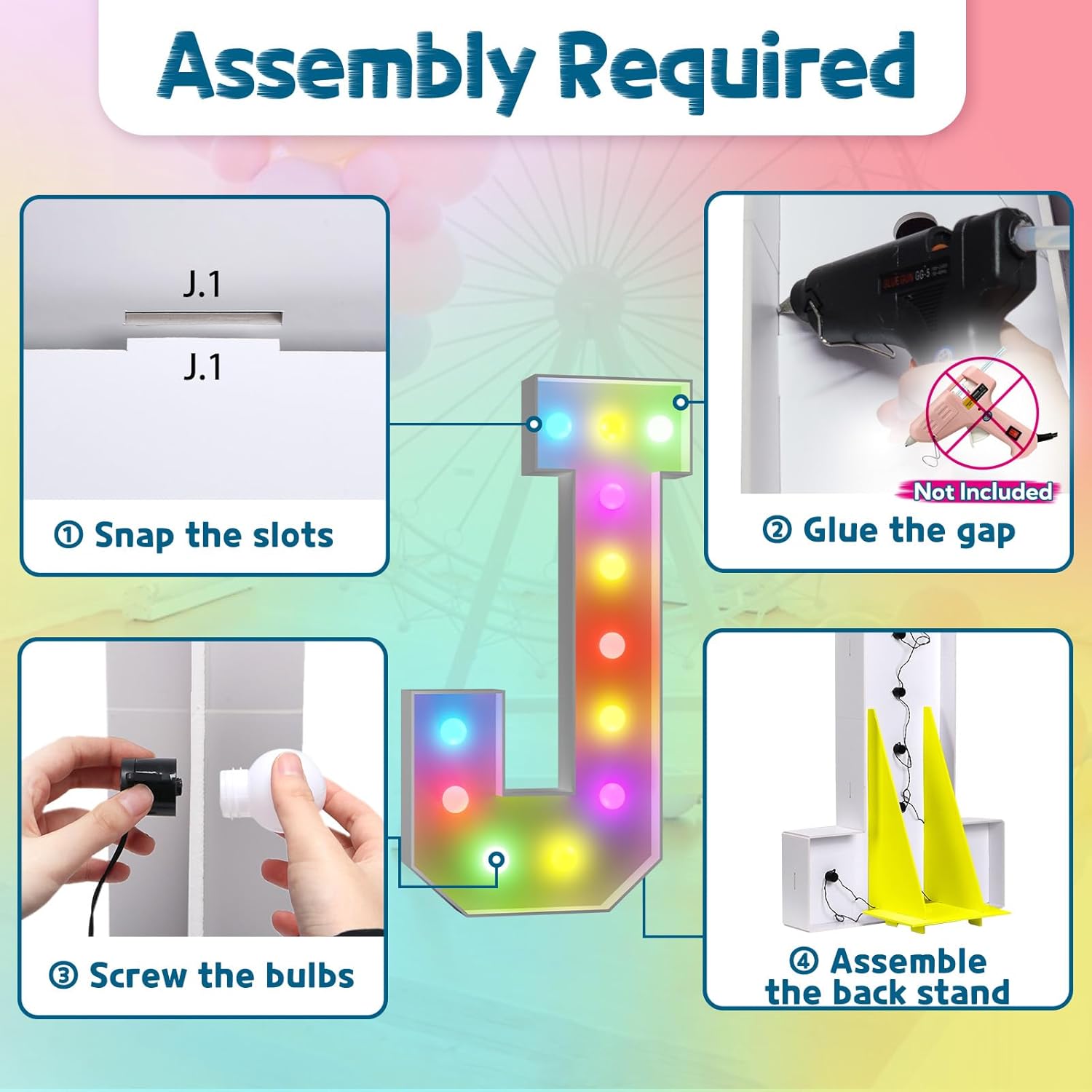 - Assembly Required. To assemble the light up numbers and letters, a hot glue gun is necessary. We have conveniently pre-cut the numbers into several pieces for your convenience. Simply consult the included instruction manual to easily assemble the impressive 4 ft tall and 3ft tall marquee numbers and letters using a hot glue gun.