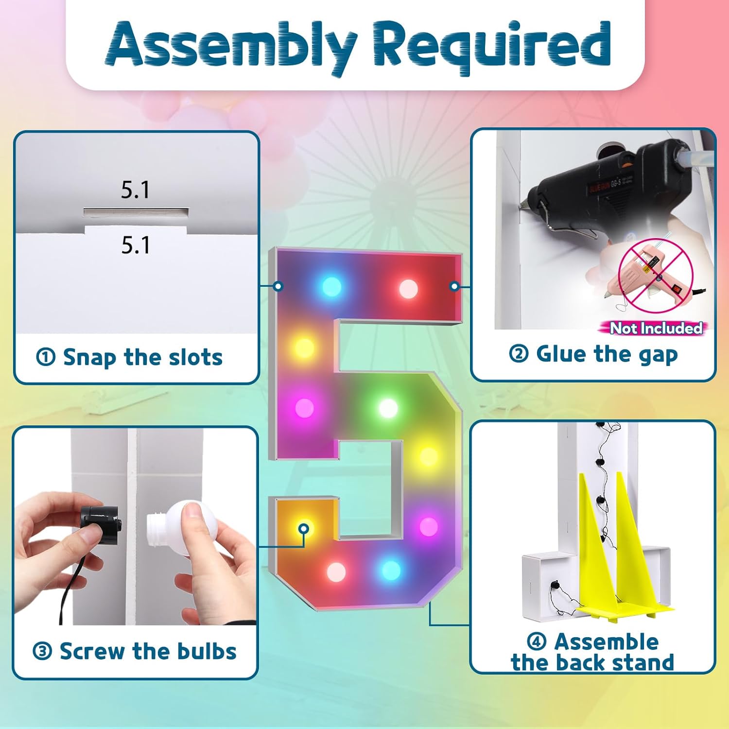 - Assembly Required. To assemble the light up numbers and letters, a hot glue gun is necessary. We have conveniently pre-cut the numbers into several pieces for your convenience. Simply consult the included instruction manual to easily assemble the impressive 4 ft tall and 3ft tall marquee numbers and letters using a hot glue gun.
