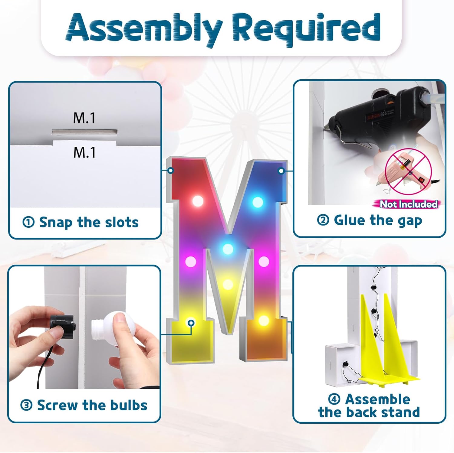 - Assembly Required. To assemble the light up numbers and letters, a hot glue gun is necessary. We have conveniently pre-cut the numbers into several pieces for your convenience. Simply consult the included instruction manual to easily assemble the impressive 4 ft tall and 3ft tall marquee numbers and letters using a hot glue gun.
