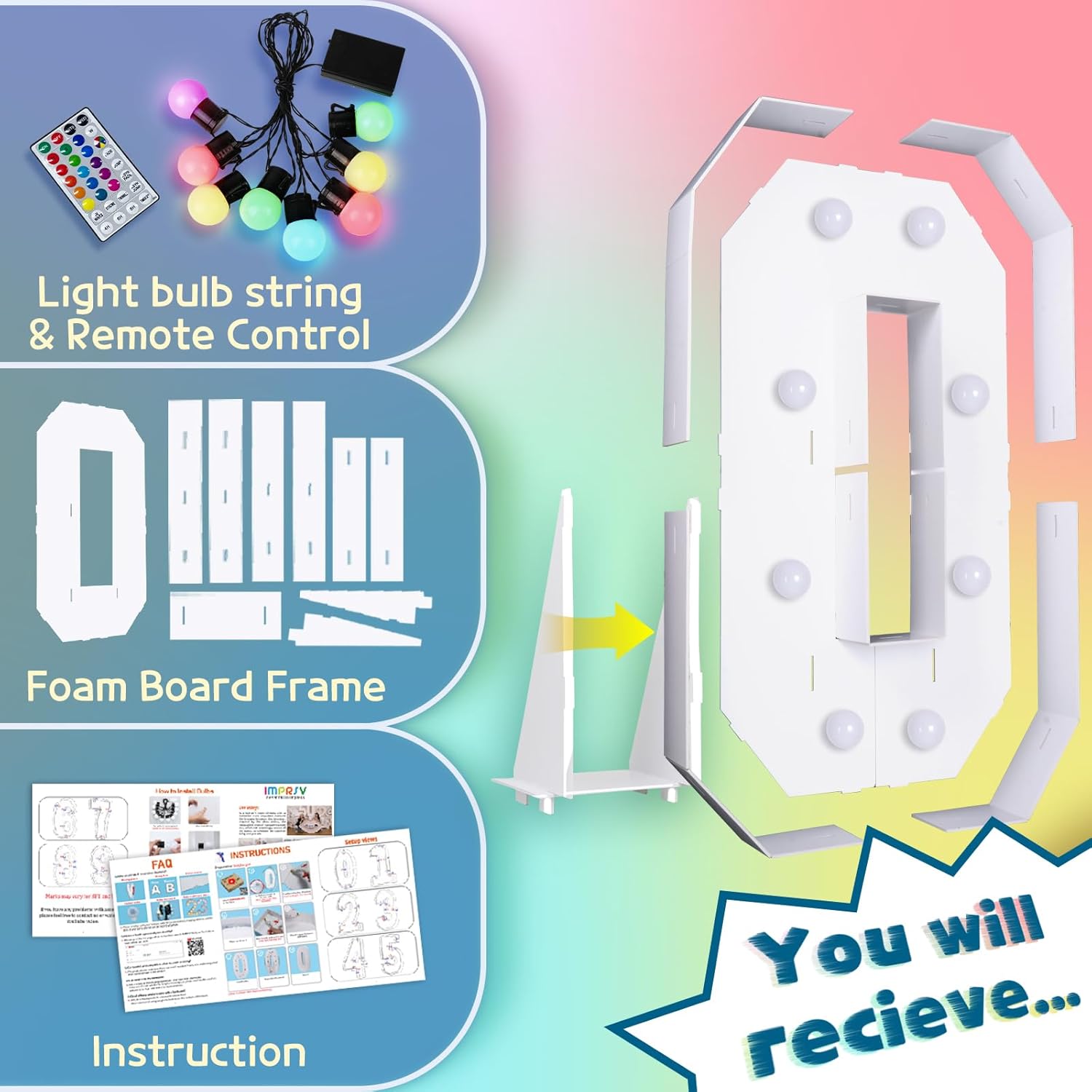 imprsv 3FT Colorful Marquee Numbers,18 Colors Number 0 with Remote, Light Up Numbers Sign for 50th Birthday Decorations Anniversary Party Decor, Pre-Cut Foam Board Kit, Mosaic Sign for Balloon