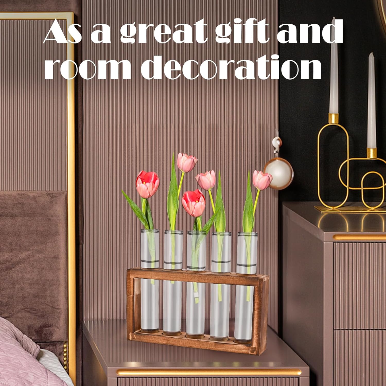 Desktop Glass Plant Propagation Station with 5 Test Tubes in Wooden Stand - Hydroponic Plants Cutting Office Home Decoration and Garden Decor Terrarium (5 Tubes)
