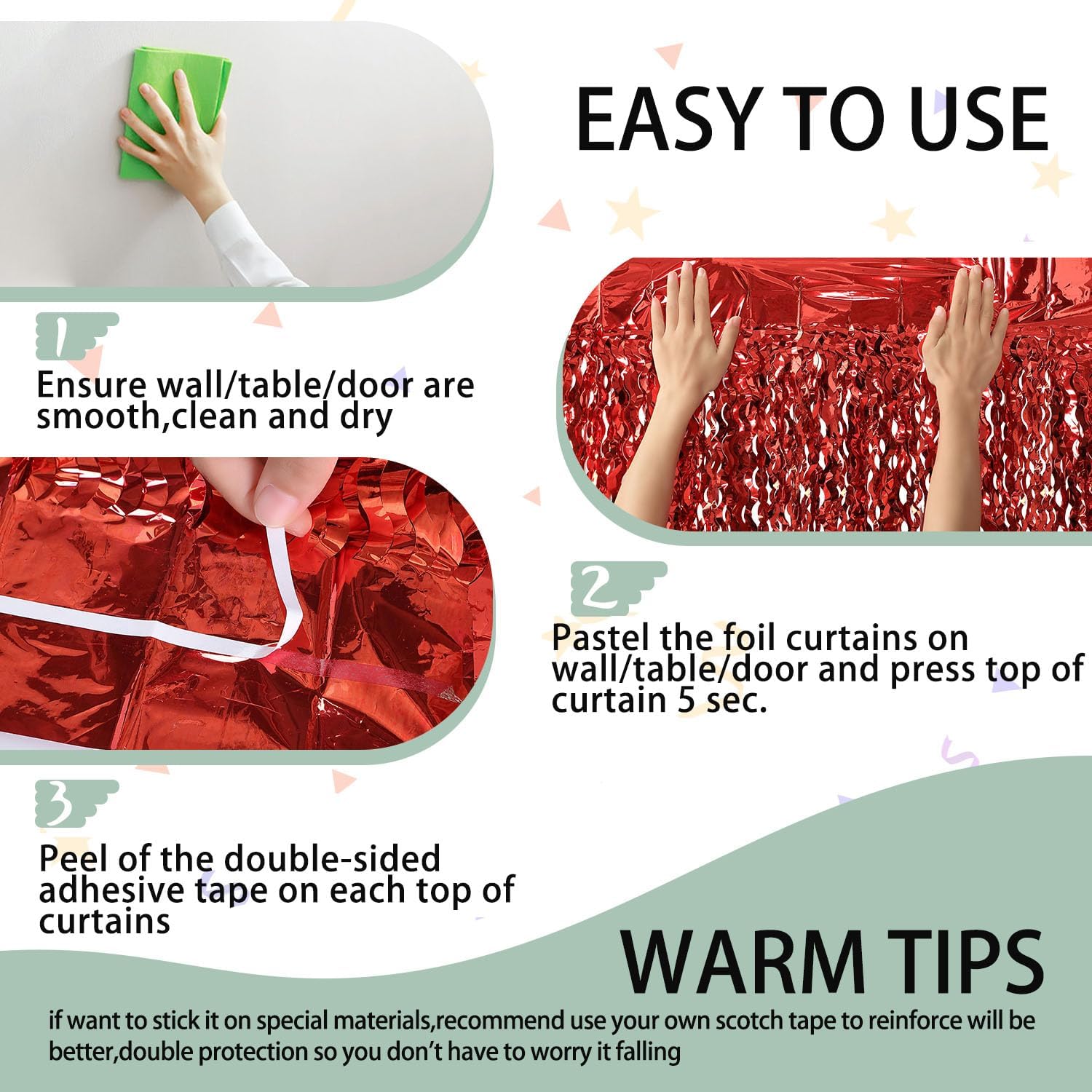 3 Pack Red Aluminium Foil Curtains, 3.3ft x 6.6ft, Wavy Shape, for Party Decorations & Photo Background